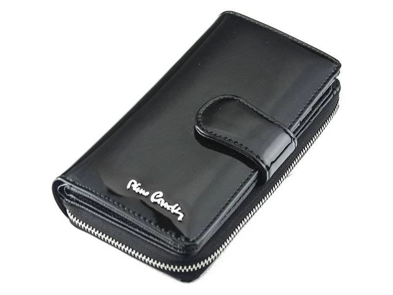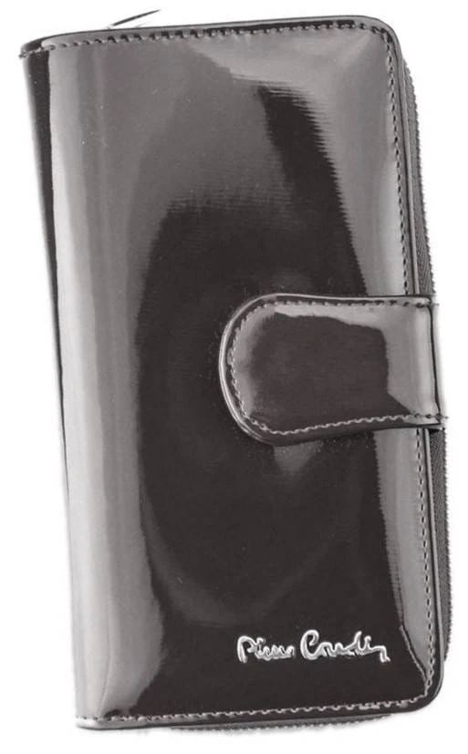 Pionowy, lakierowany portfel damski z opaską na zatrzask — Pierre Cardin