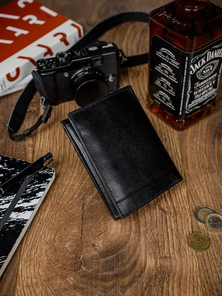 - uszyty z bydlęcej skóry naturalnej, bardzo trwałej i przyjemnej w dotyku. Czarny kolor to klasyka gatunku - dopasujesz portfel do butów czy paska