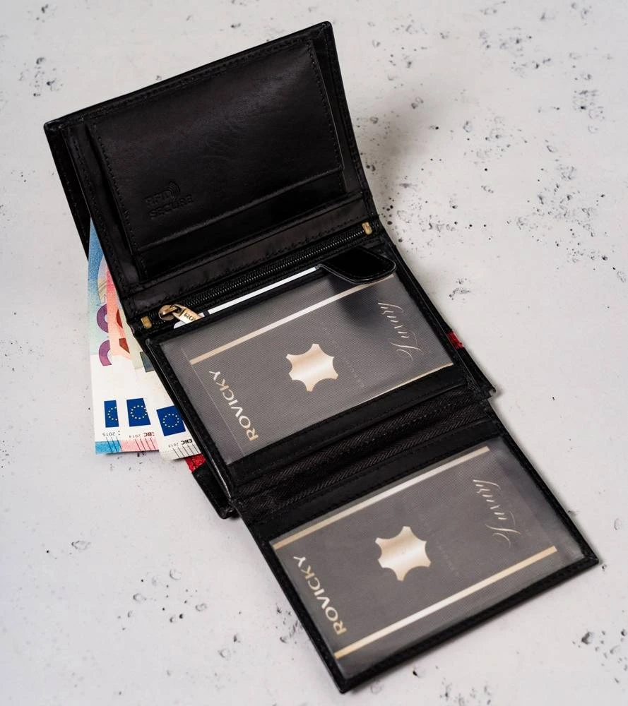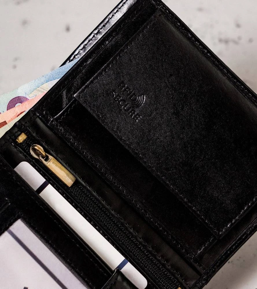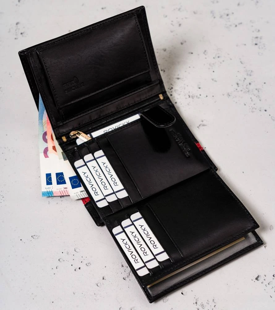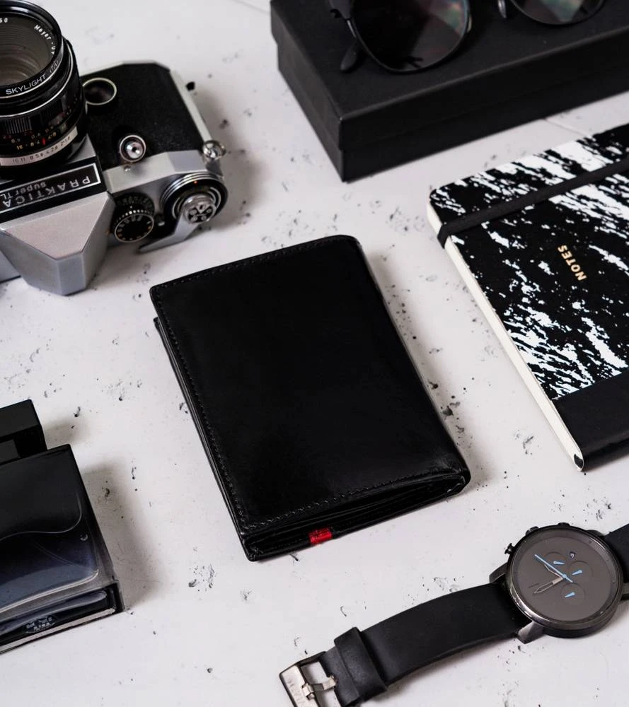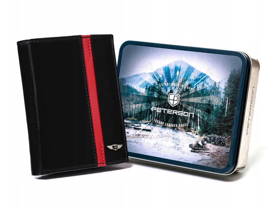 - Ponadczasowy wygląd | Czarny kolor to klasyka, a portfel w tym kolorze daje poczucie komfortu i świadomość, że możesz poczuć się modnie. Front portfela zdobi elegancki czerwony pasek