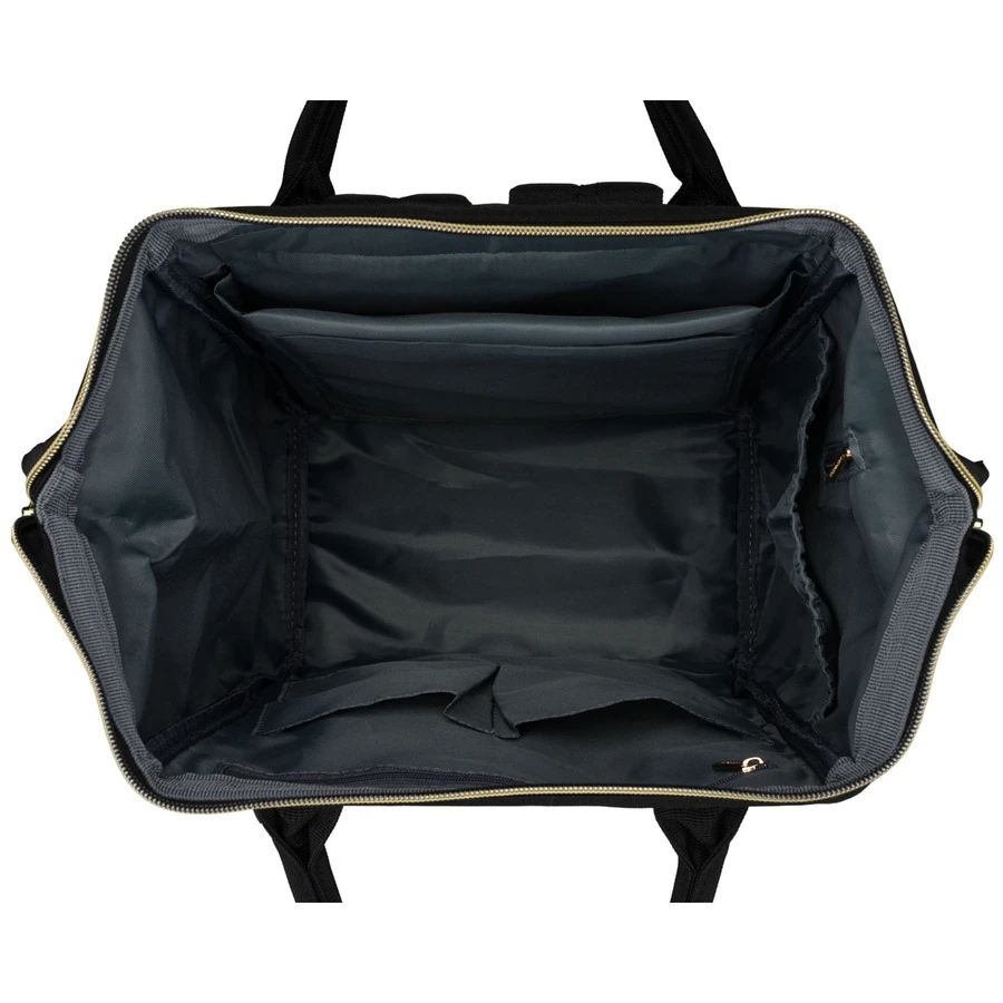 Plecak posiada druciane wzmocnienie wszyte w główny rant, co nadaje mu stabilną konstrukcję i ułatwia szerokie otwieranie komory głównej. Dzięki temu rozwiązaniu dostęp do wnętrza plecaka jest szybki i wygodny, podobnie jak w klasycznych torbach lekarskich.