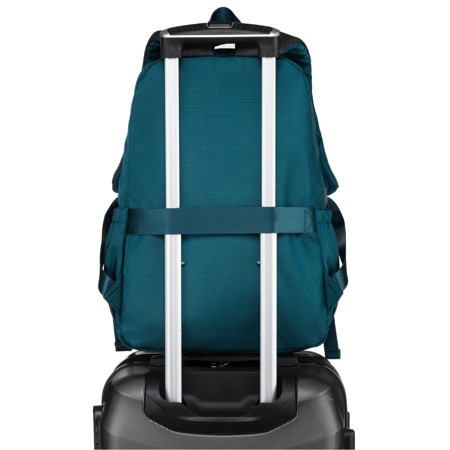 Na tylnej części plecaka znajduje się specjalny pasek, który umożliwia stabilne przymocowanie go do rączki walizki. To praktyczne rozwiązanie ułatwia przemieszczanie się na lotnisku i zwiększa komfort podróżowania.