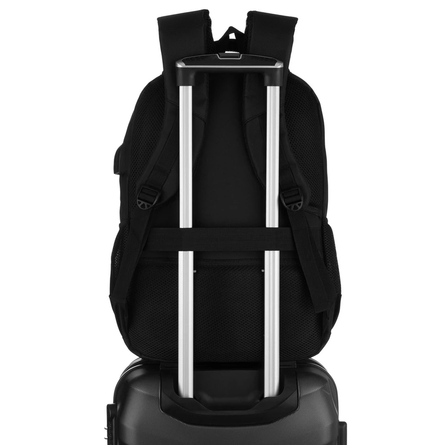 Specjalny pas umożliwia zamocowanie plecaka na walizce, co ułatwia podróżowanie.