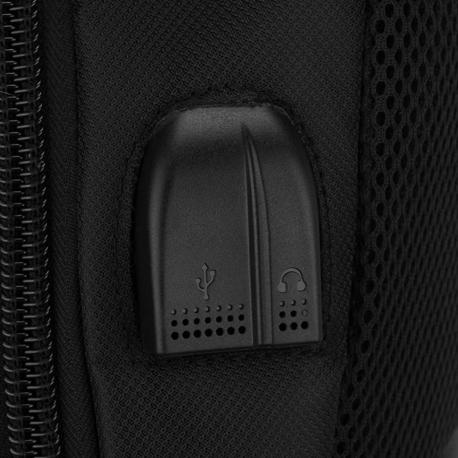 Wbudowany port USB i jack umożliwia wygodne ładowanie telefonu oraz słuchanie muzyki bez wyciągania urządzenia z plecaka.