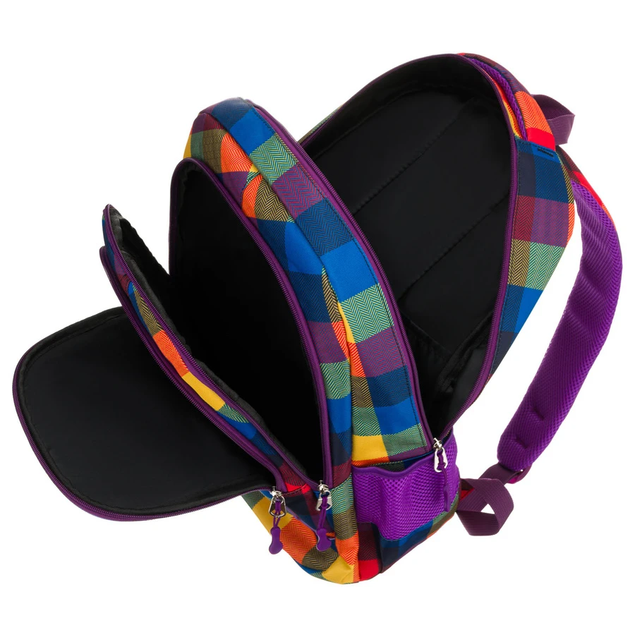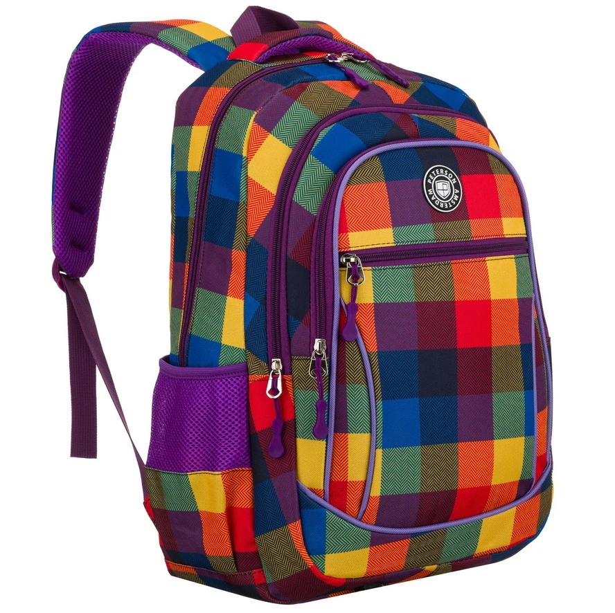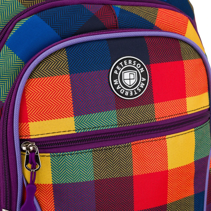 Lekki plecak szkolny Peterson w kratę – wykonany z wytrzymałego poliestru, waży tylko 550 g. Posiada 2 pojemne komory, 5 kieszeni, w tym boczne na bidon, oraz szerokie, regulowane szelki zapewniające komfort noszenia. Idealny do szkoły i na wycieczki.
