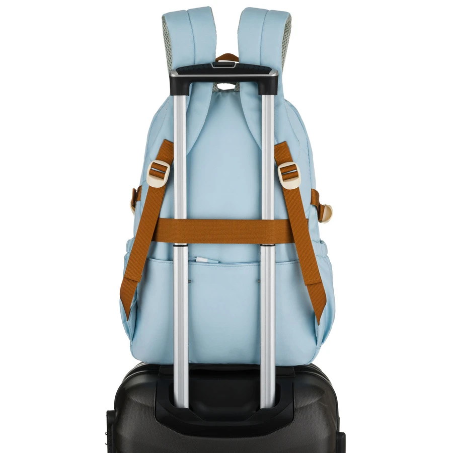 Z tyłu znajduje się specjalny pasek, który pozwala na wygodne zamocowanie plecaka na rączce walizki. To świetna opcja podczas szkolnych wyjazdów lub rodzinnych podróży.