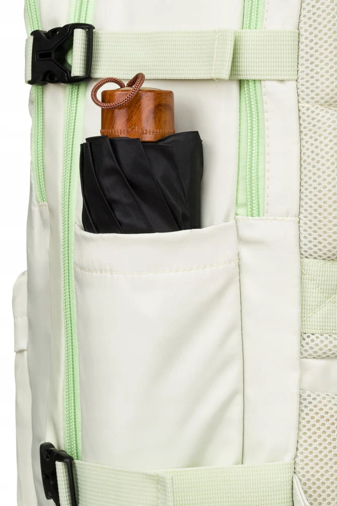 Plecak posiada dodatkowe pasy boczne z zapięciem typu FASTEX wykonane z mocnego tworzywa ABS. Pełnią funkcję kompresyjną (zmniejszenia plecaka).