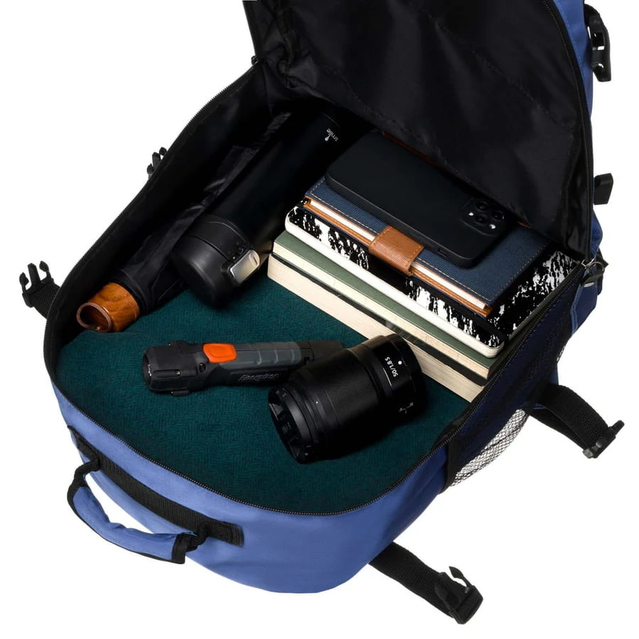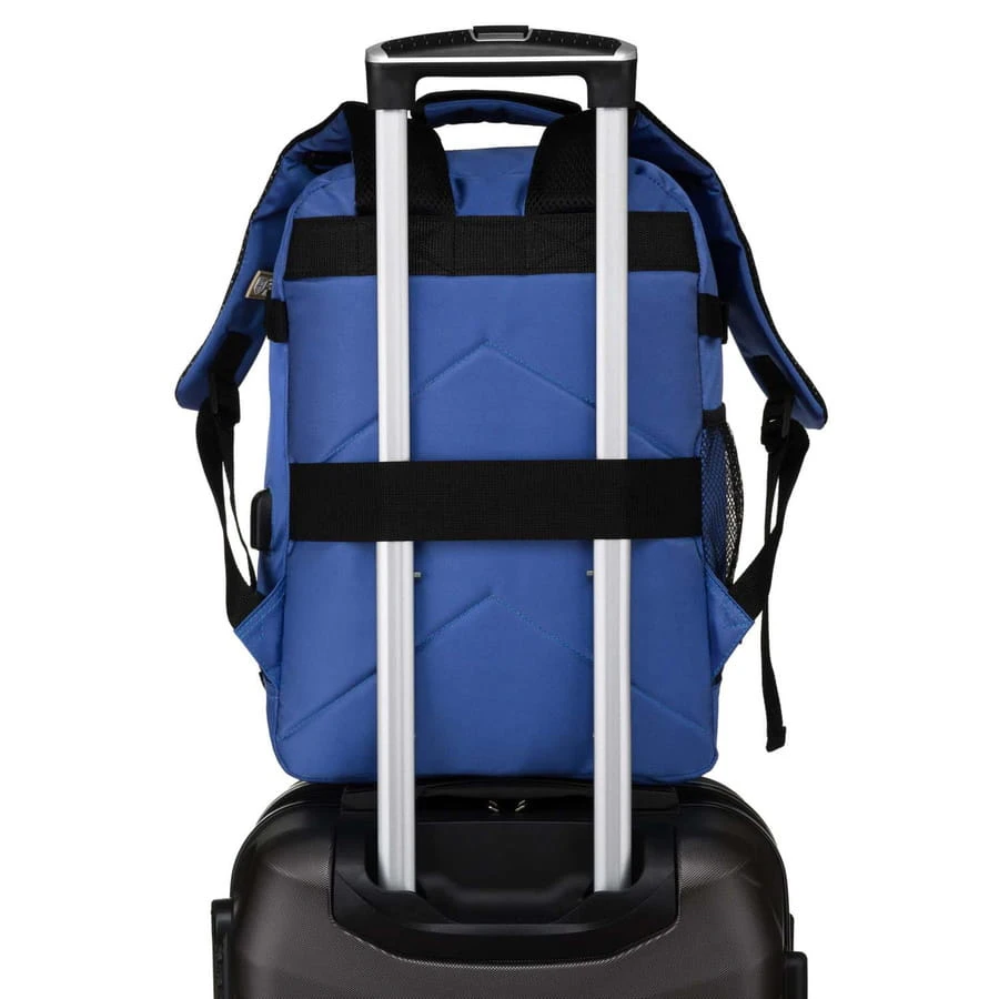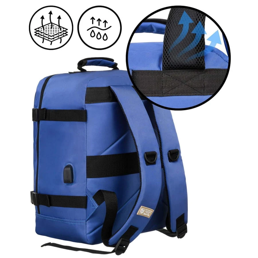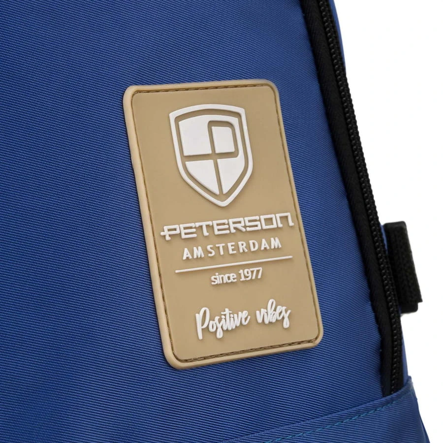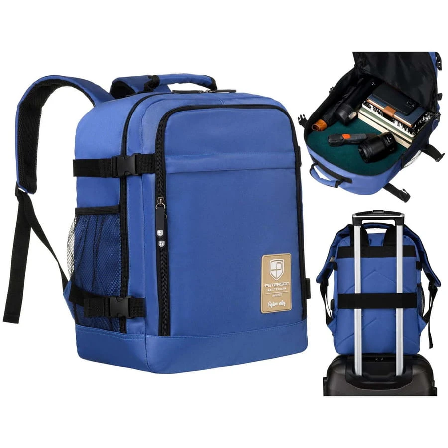 Podróżny plecak z wodoodpornego poliestru w niebieskim kolorze zawieszony na regulowanych szelkach - Peterson