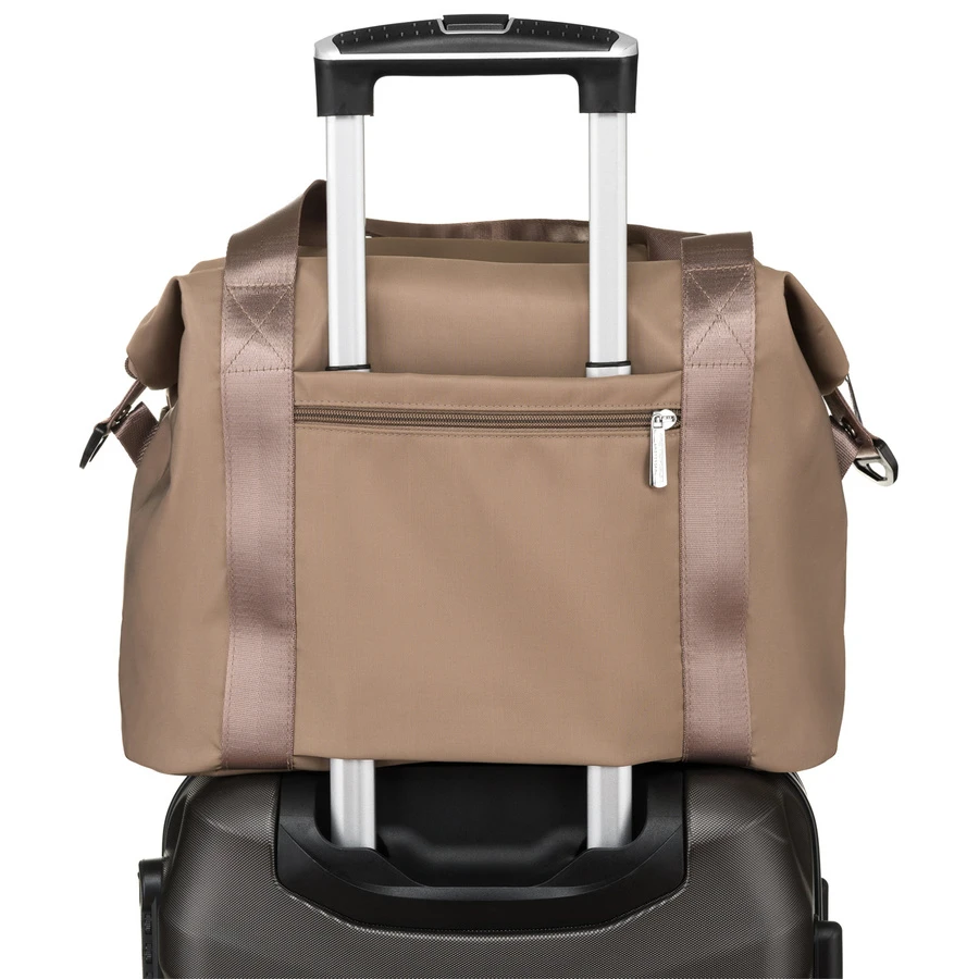 Torebka wyposażona jest w funkcjonalny uchwyt na walizkę, co czyni ją idealnym wyborem na podróże. Specjalny pasek na tylnej części torby pozwala wygodnie przymocować ją do rączki walizki.