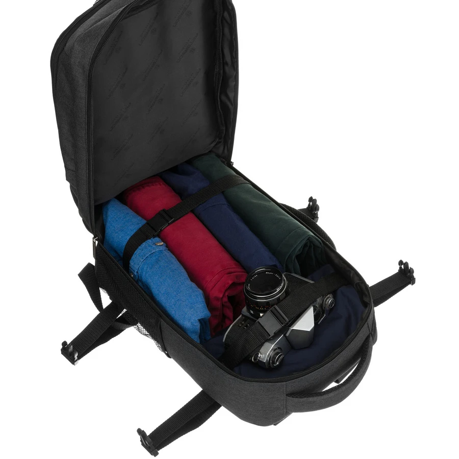 Największa komora plecaka Peterson® zapewnia maksymalną funkcjonalność. Szerokie otwarcie z suwakami umożliwia pełne rozłożenie plecaka, co ułatwia organizację zawartości. Wewnątrz znajdują się elastyczne pasy zabezpieczające, które utrzymują ubrania i rzeczy w miejscu – idealne na kilkudniowe wyjazdy. Plecak bez problemu pomieści sweter, kilka koszulek, spodnie, bieliznę i lekką kurtkę, zastępując tradycyjny bagaż kabinowy.