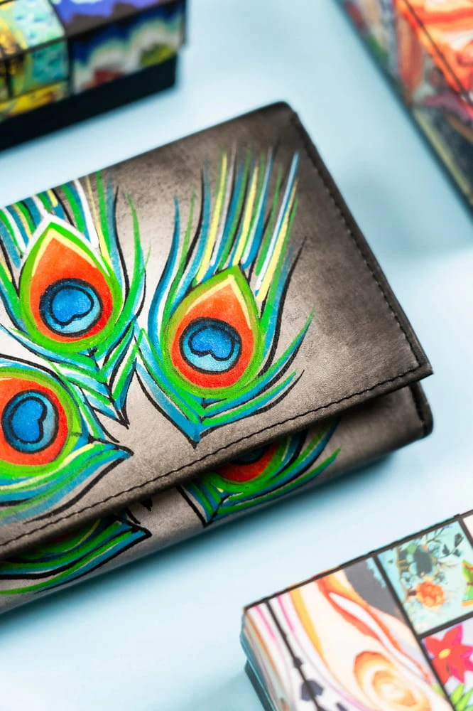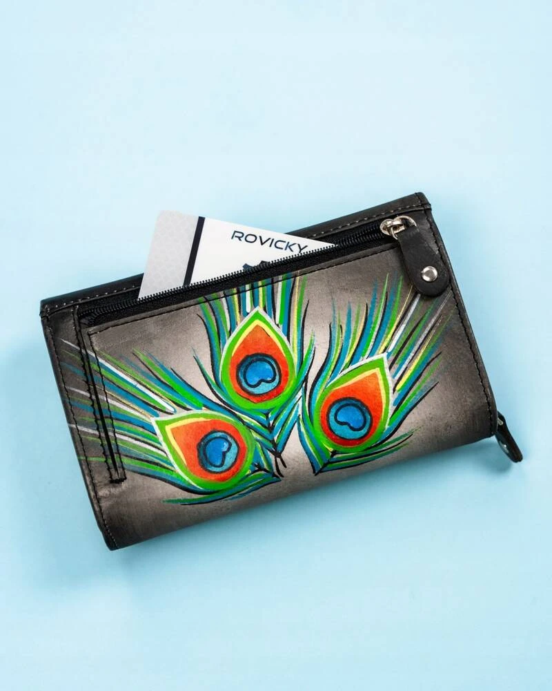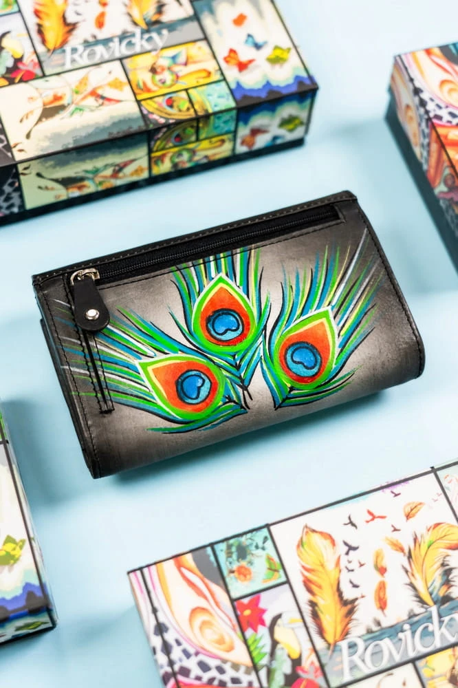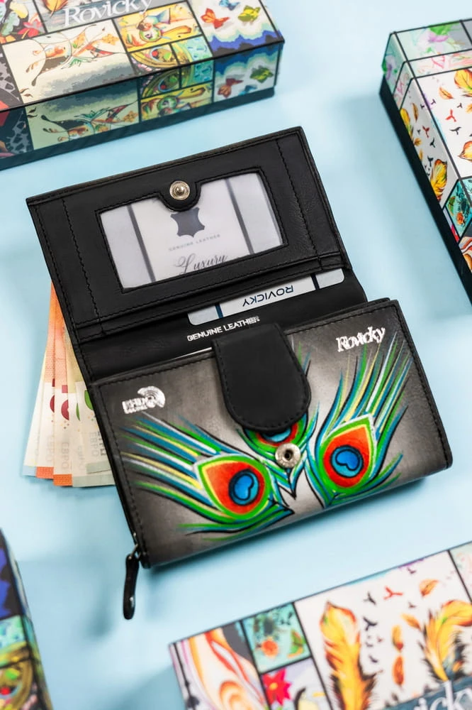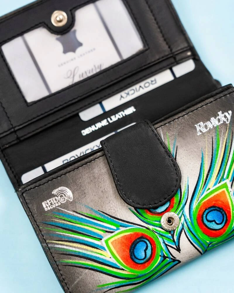 Pojemny, skórzany portfel damski na zatrzask ze wzorem pawich piór - Rovicky
