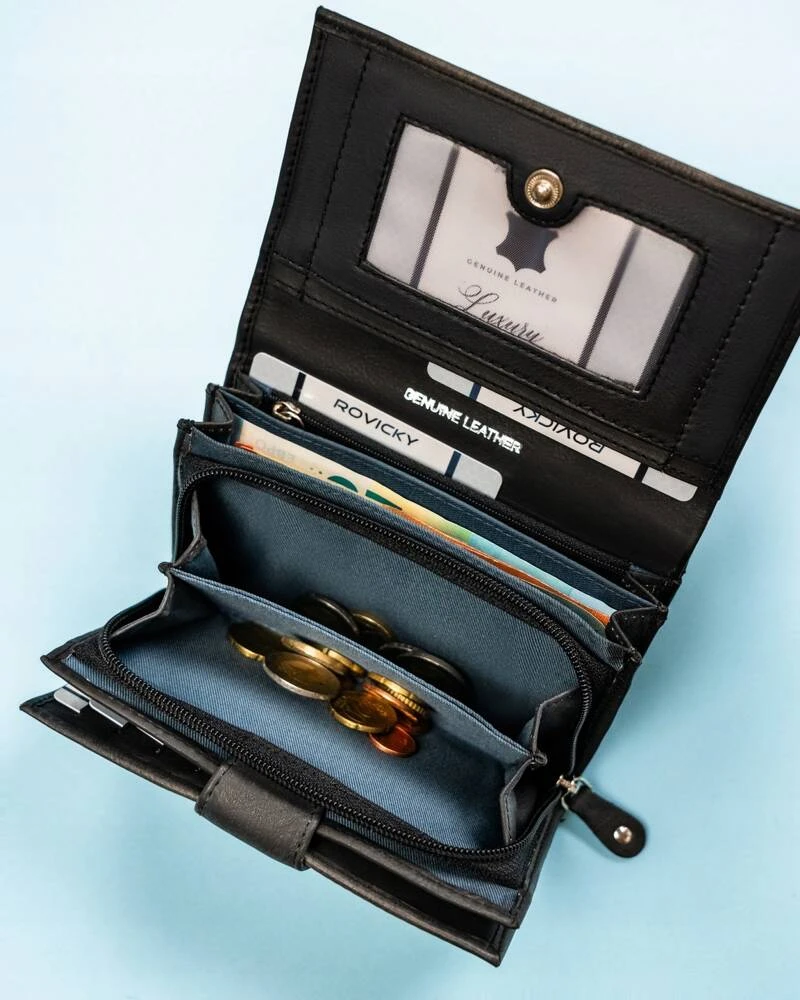 Dzięki sporej ilości schowków portfel znacząco ułatwi Ci segregacje gotówki. Jeśli potrzebujesz przechowywać kilka walut, możesz bez problemu je rozdzielić.
