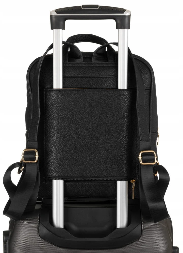 Tylna kieszeń ma dodatkową funkcję - po odsunięciu zamka zmienia się w uchwyt na walizkę.