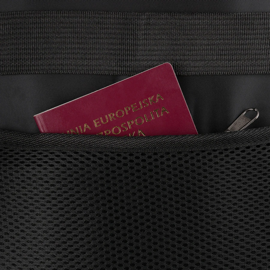 Na tylnej części plecaka znajduje się praktyczny pas umożliwiający zamocowanie plecaka na rączce walizki. To rozwiązanie znacząco zwiększa komfort podróżowania: