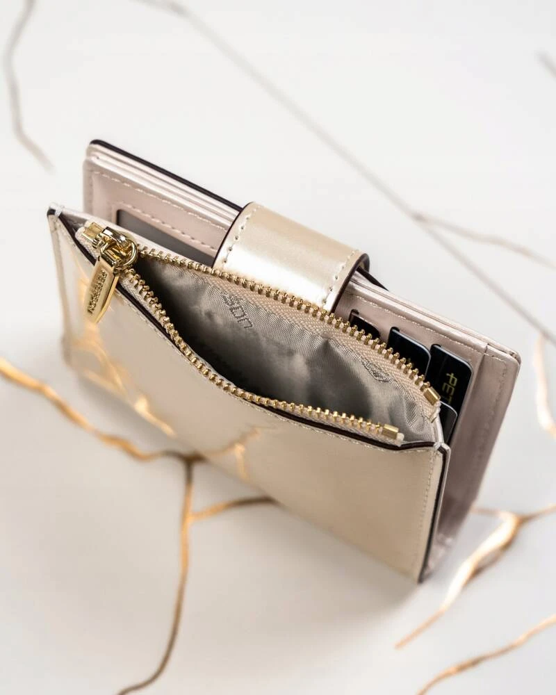 Pojemny, dwukomorowy portfel damski z zapięciem na zatrzask i suwak. Pierwsza jego część wyposażona jest w szereg praktycznych przegródek do przechowywania kart i dokumentów.