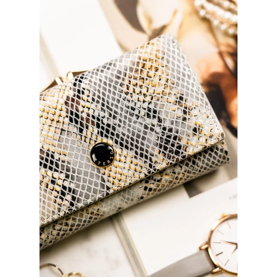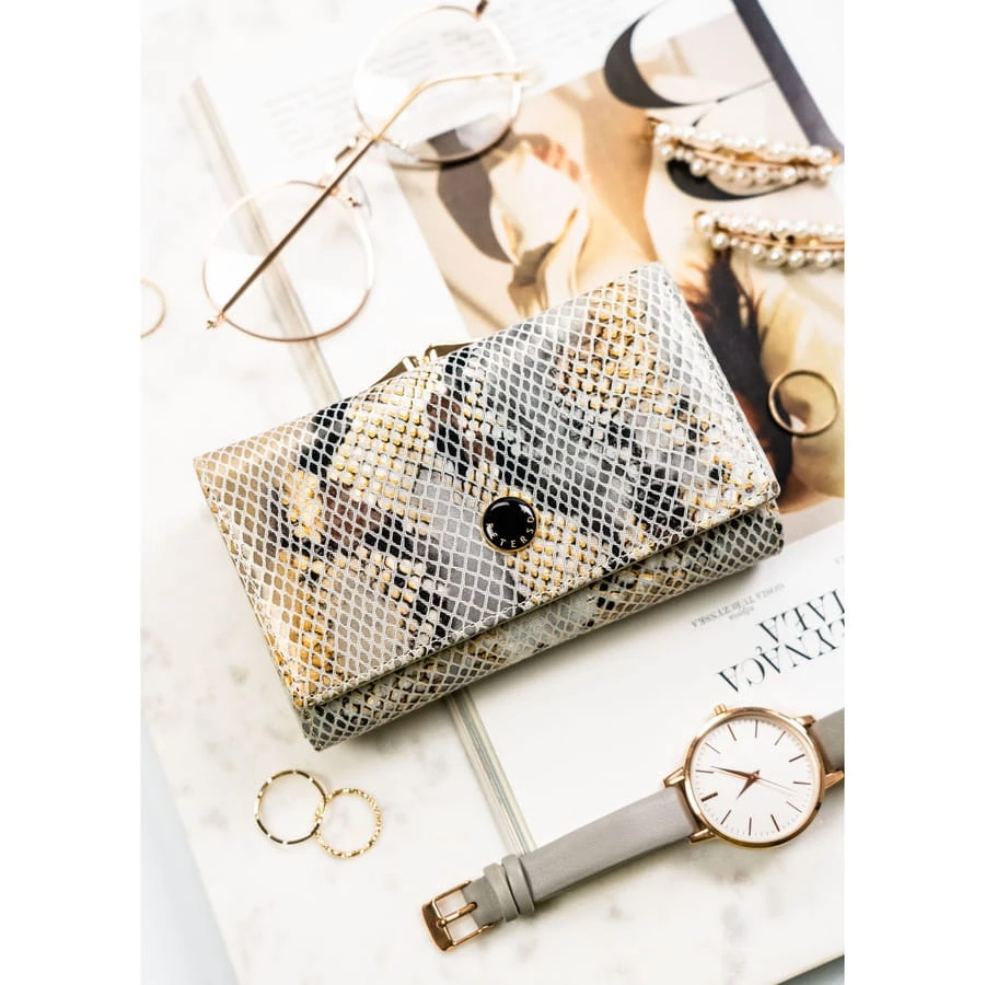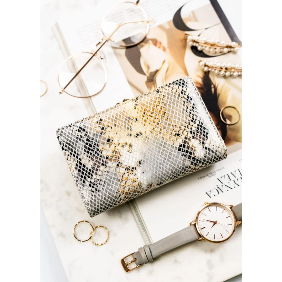- Niespotykany design | Portfel posiada unikalny wzór inspirowany skórą węża, z dominującymi odcieniami bieli, szarości, beżu oraz czerni, co nadaje mu elegancki i nowoczesny wygląd.