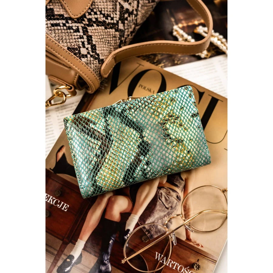 - Niespotykany design | Jego głównym elementem jest tekstura przypominająca skórę węża, skomponowana za pomocą błyszczącej siatki w niebieskim odcieniu z tłem o szarych i żółtych akcentach. Portfel ma elegancki, połyskujący wygląd, co nadaje mu luksusowego charakteru. Na przedniej części widoczny jest emblemat, który dodatkowo podkreśla markowy charakter produktu.