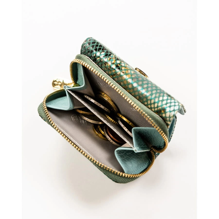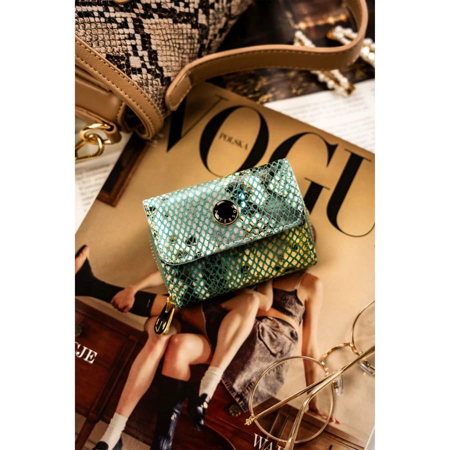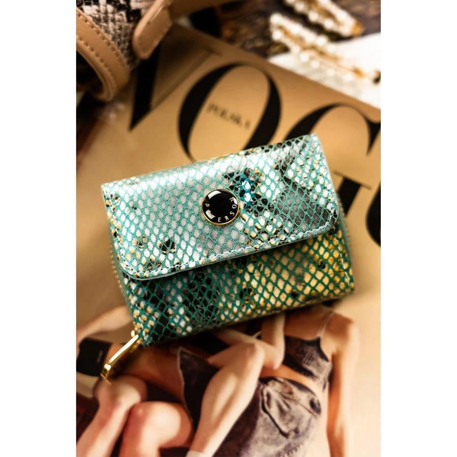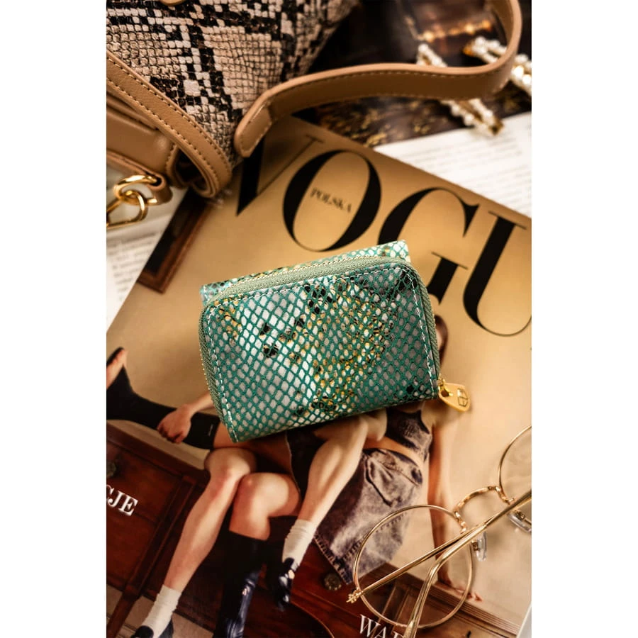 - Skóra naturalna | Jego głównym elementem jest tekstura przypominająca siatkę w odcieniu niebieskim, co sprawia, że tło z mieniącymi się złotymi i szarymi akcentami przypomina wężową skórę. Portfel ma elegancki, połyskujący wygląd, co nadaje mu luksusowego charakteru. Na przedniej części widoczny jest błyszczący, elegancki emblemat, który dodatkowo podkreśla markowy charakter produktu. Zapięcie suwaka ozdobione piękną, złotą zawieszką z logo.