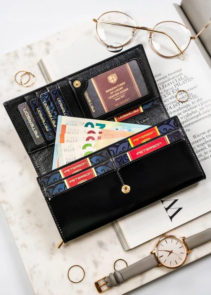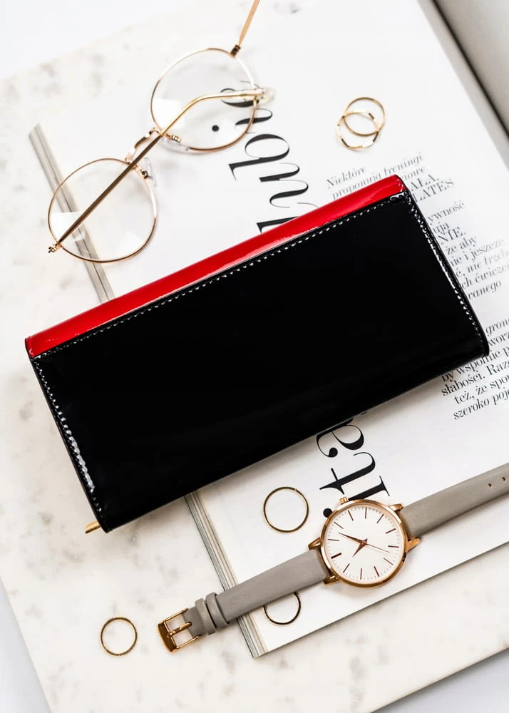 - Klasyczna konstrukcja | Portfel o orientacji poziomej, zamykany na zatrzask;