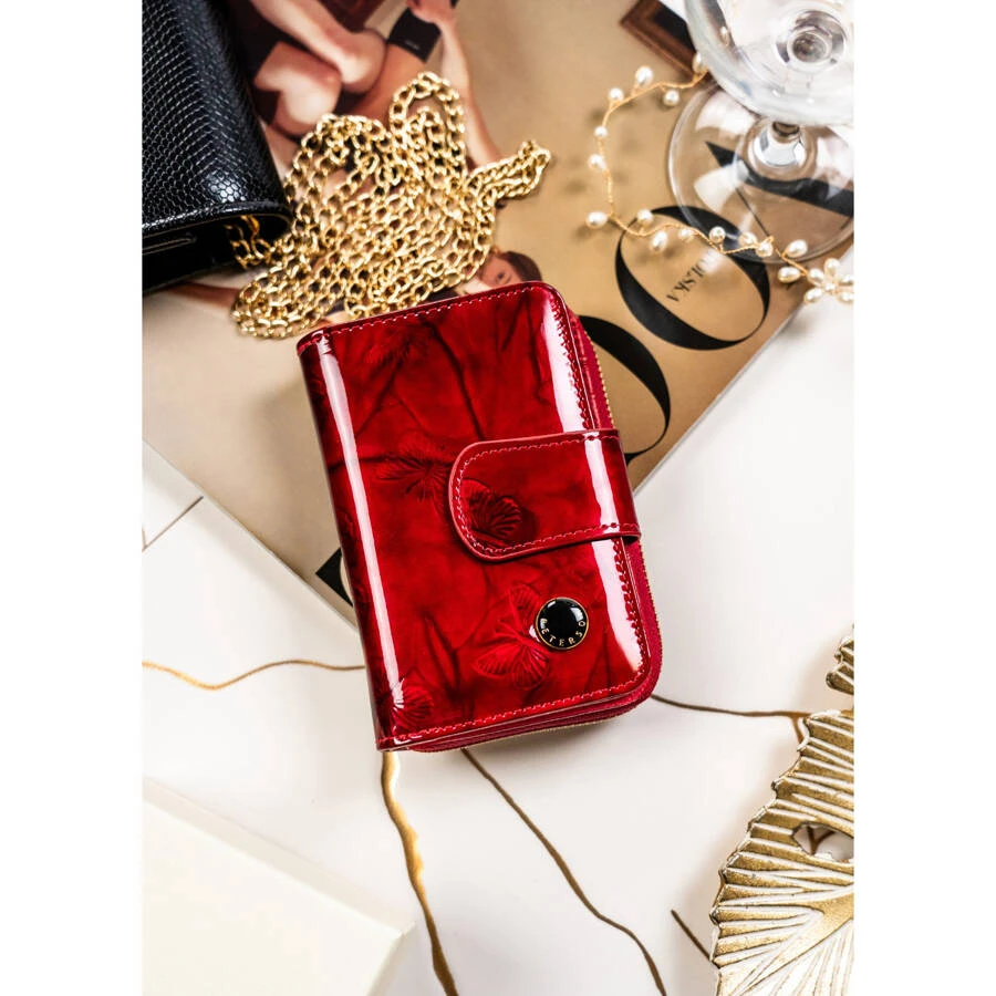 - Zewnętrzna strona portfela, wykonana z lakierowanej skóry naturalnej, ozdobiona jest delikatnymi, tłoczonymi motywami motyli.