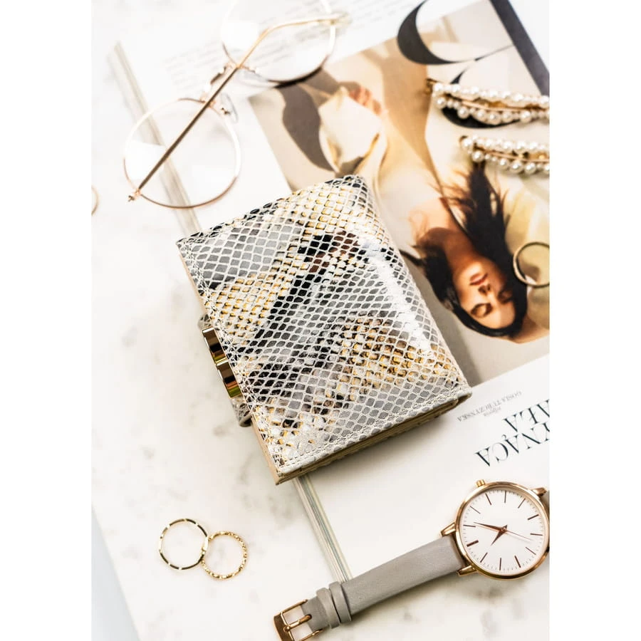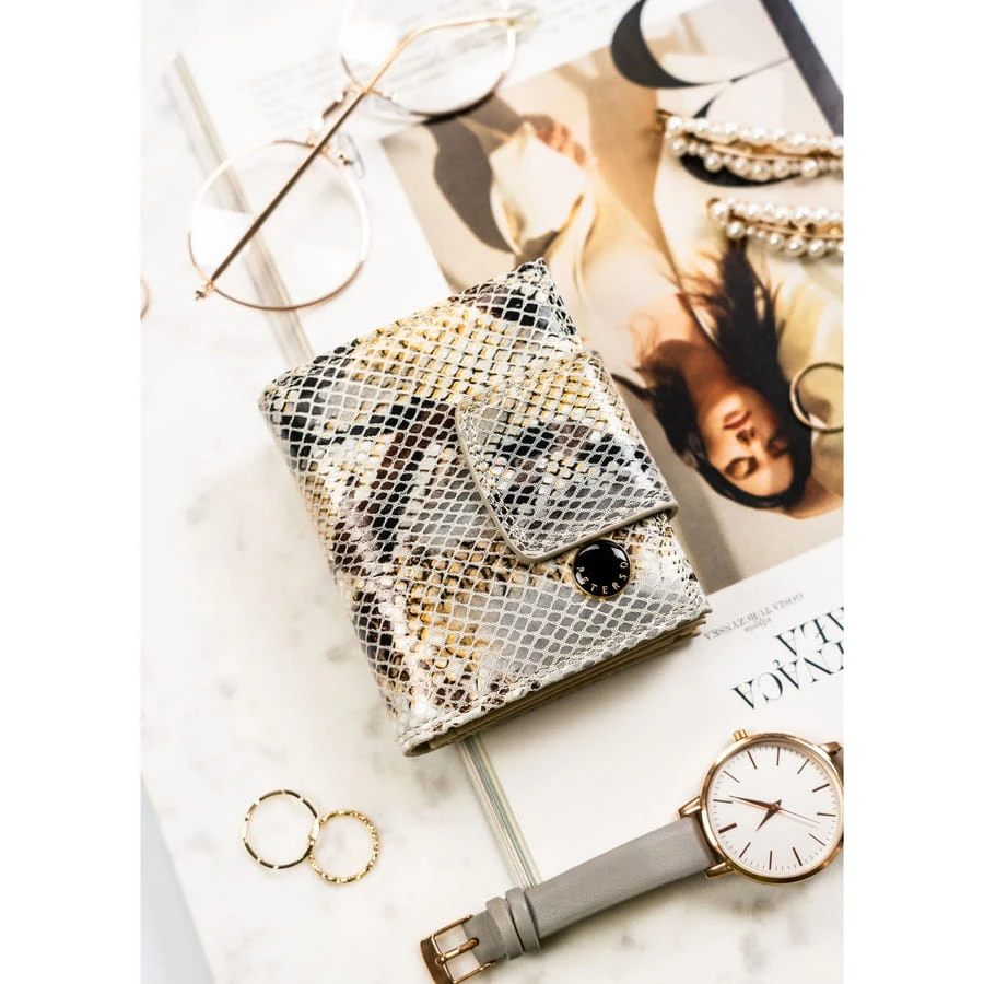 - Unikalny design | Portfel posiada unikalny wzór inspirowany skórą węża, z dominującymi odcieniami bieli, szarości, beżu oraz czerni, co nadaje mu elegancki i nowoczesny wygląd. Powierzchnia pokryta jest siateczkowatą strukturą, która dodatkowo podkreśla egzotyczny design.