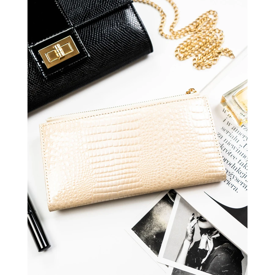 Poziomy, beżowy portfel damski ze skóry ekologicznej z tłoczeniem na wzór skóry krokodyla - Peterson