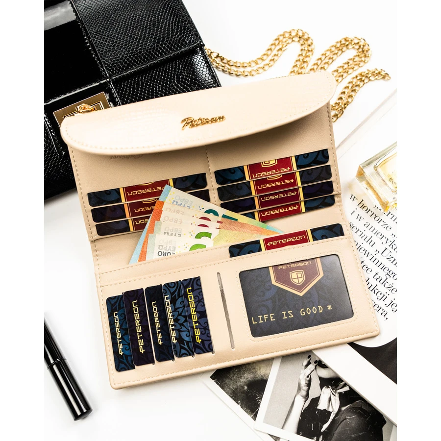 - Dodatkowo zamykana na suwak kieszonka na bilon zapewnia bezpieczeństwo drobnych monet i zapobiega ich przypadkowemu wysypywaniu się.