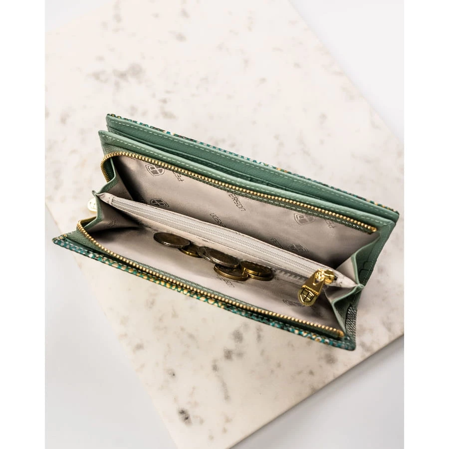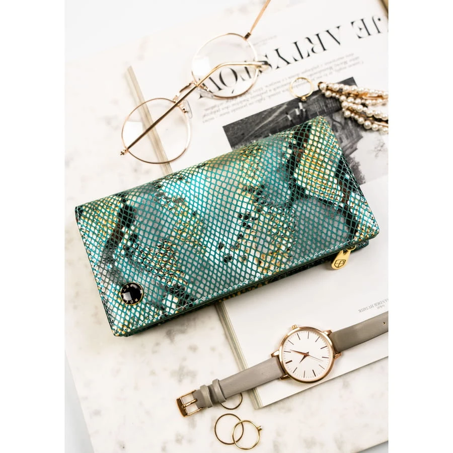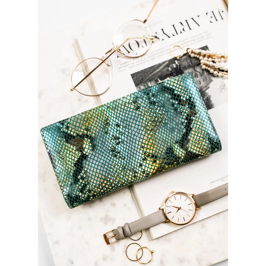 - Portfel ma elegancki, lakierowany wygląd z tłoczoną fakturą przypominającą skórę węża.
