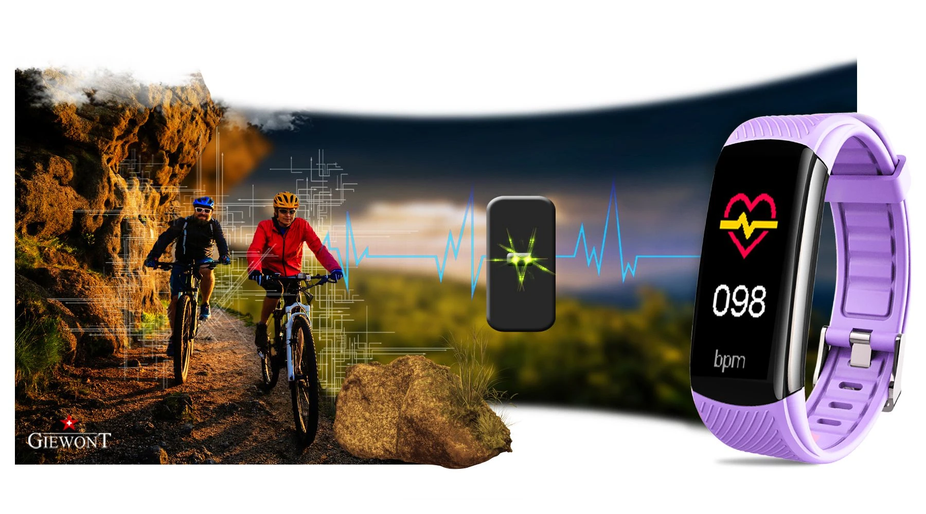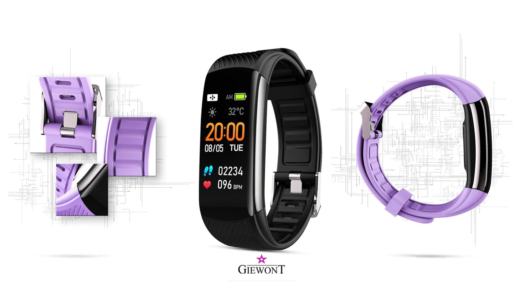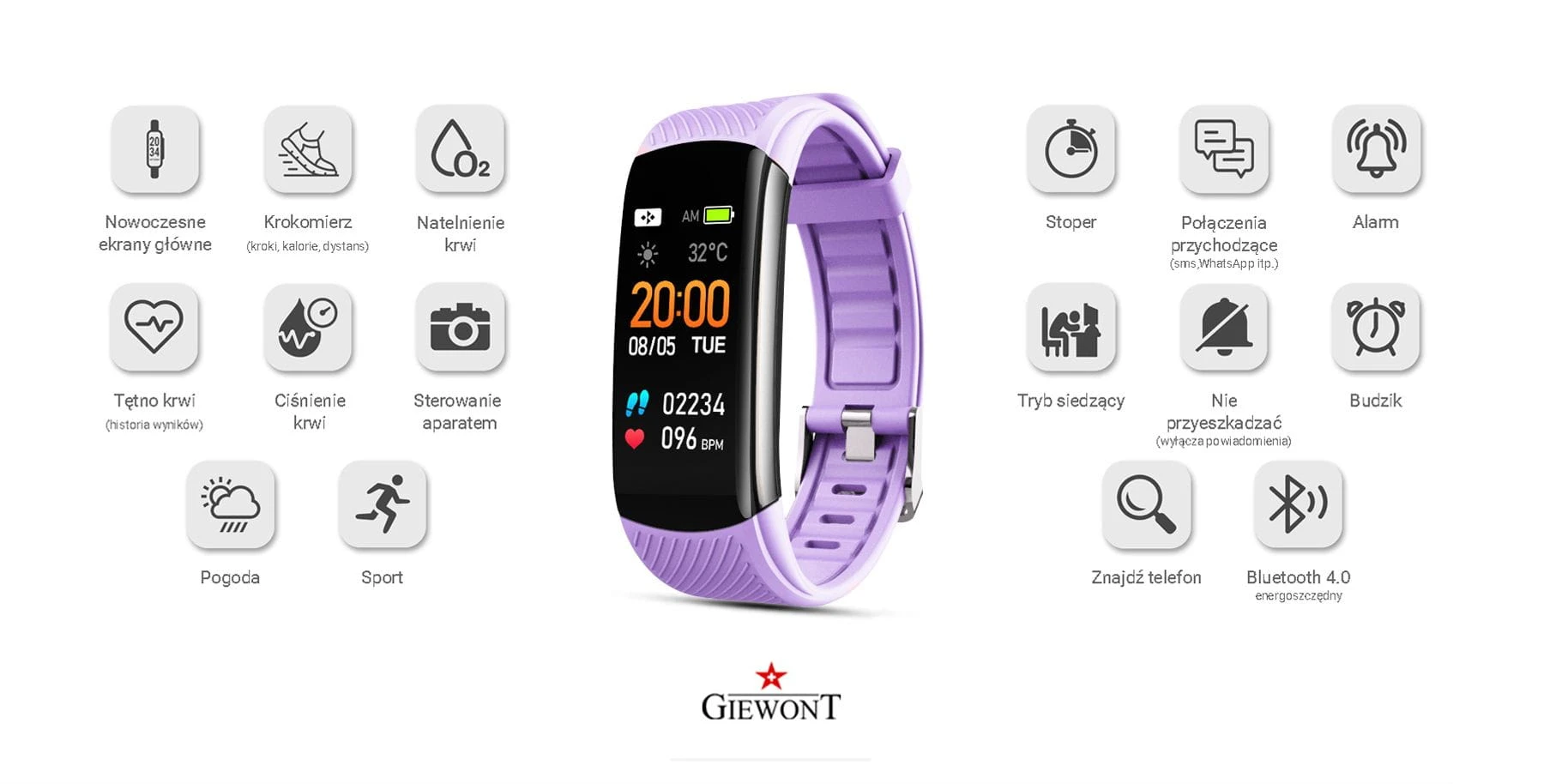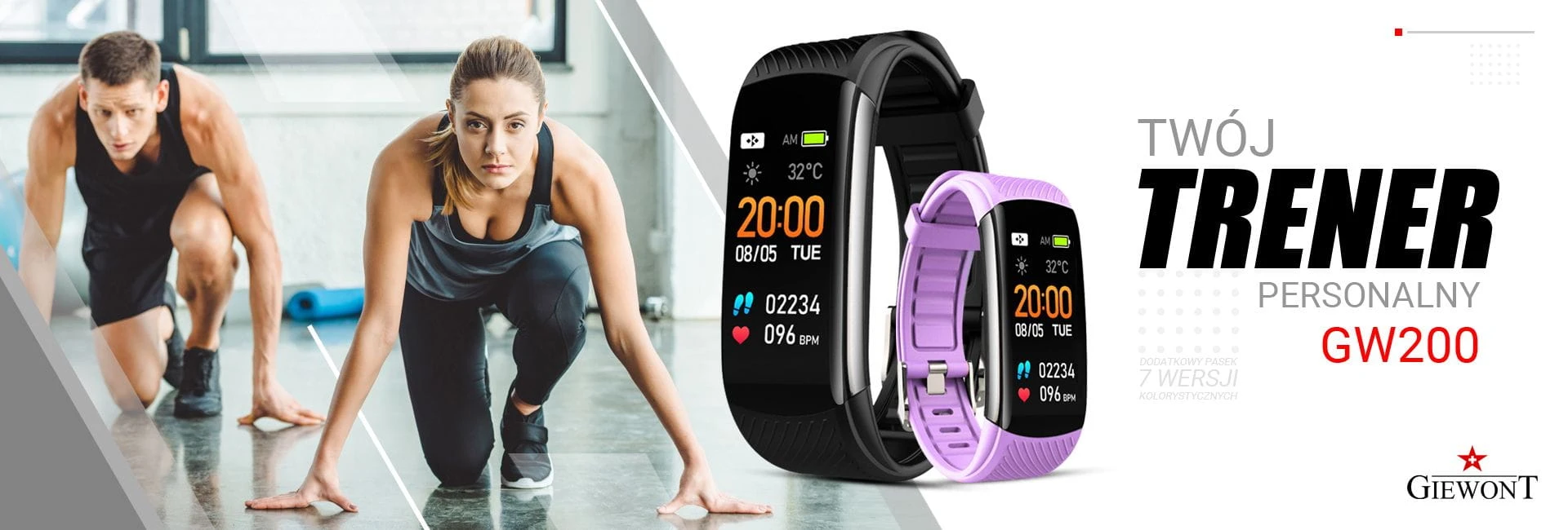 Smartband Giewont Fit&GO Duo GW200 – opaska sportowa, tętno, IP67, Bluetooth, czarny + lawendowy pasek – zegarek męski Giewont granatowy | niua.pl