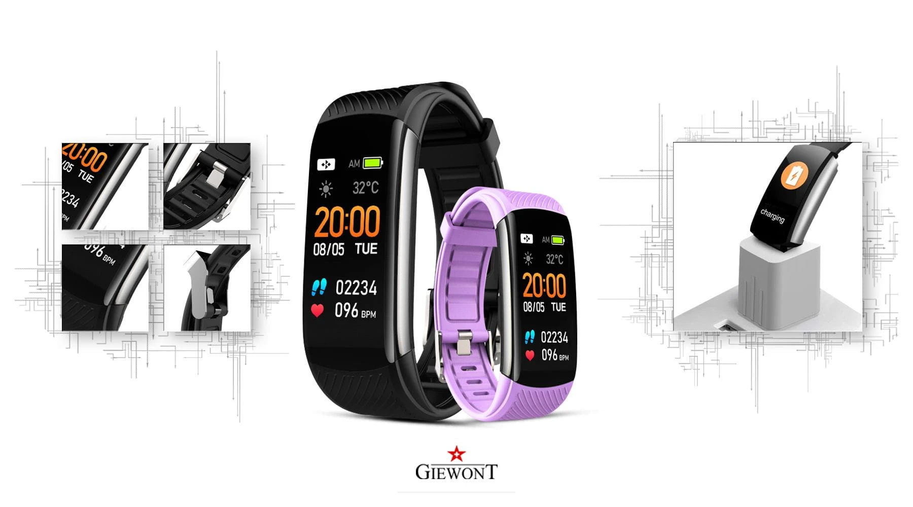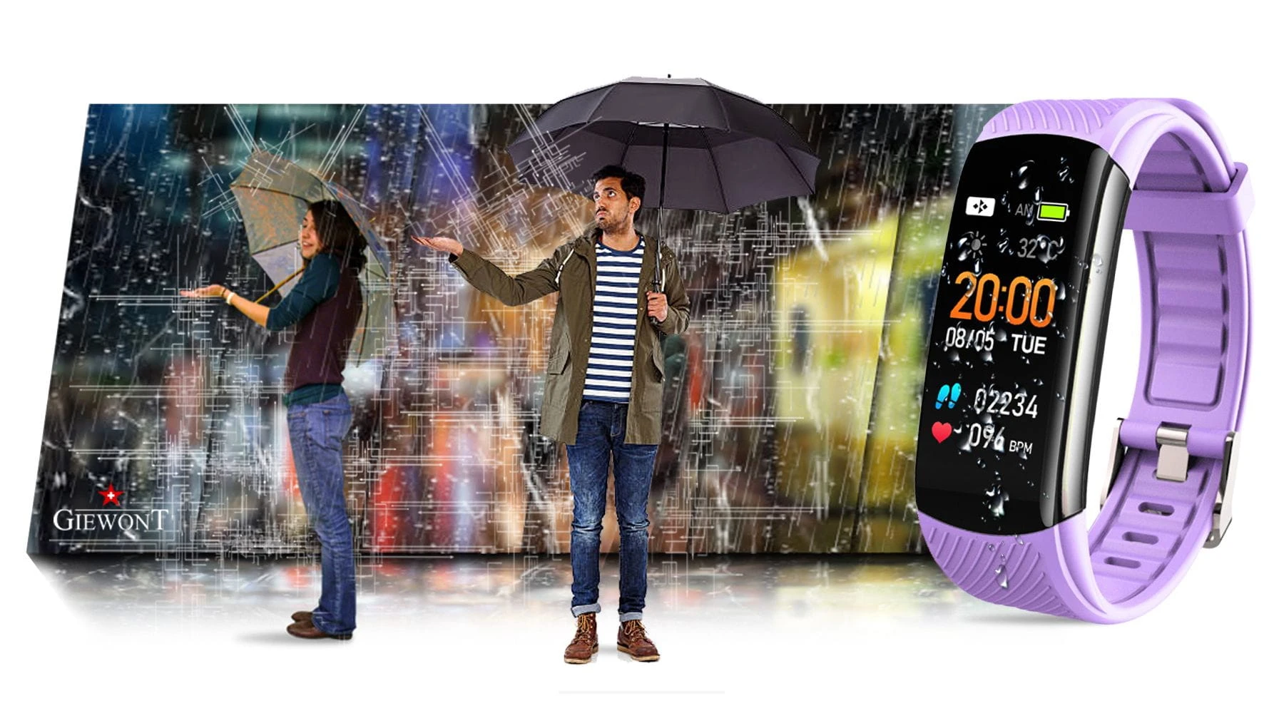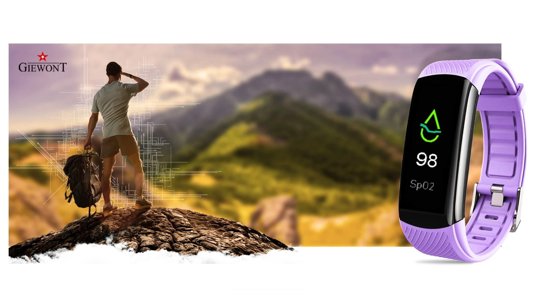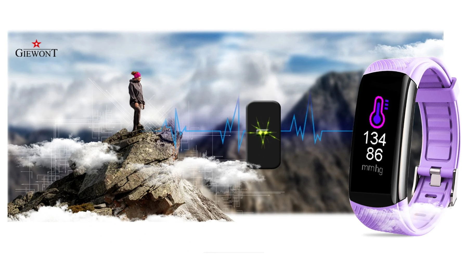 Smartband Giewont Fit&GO Duo GW200 – opaska sportowa, tętno, IP67, Bluetooth, czarny + lawendowy pasek – zegarek męski Giewont granatowy | niua.pl