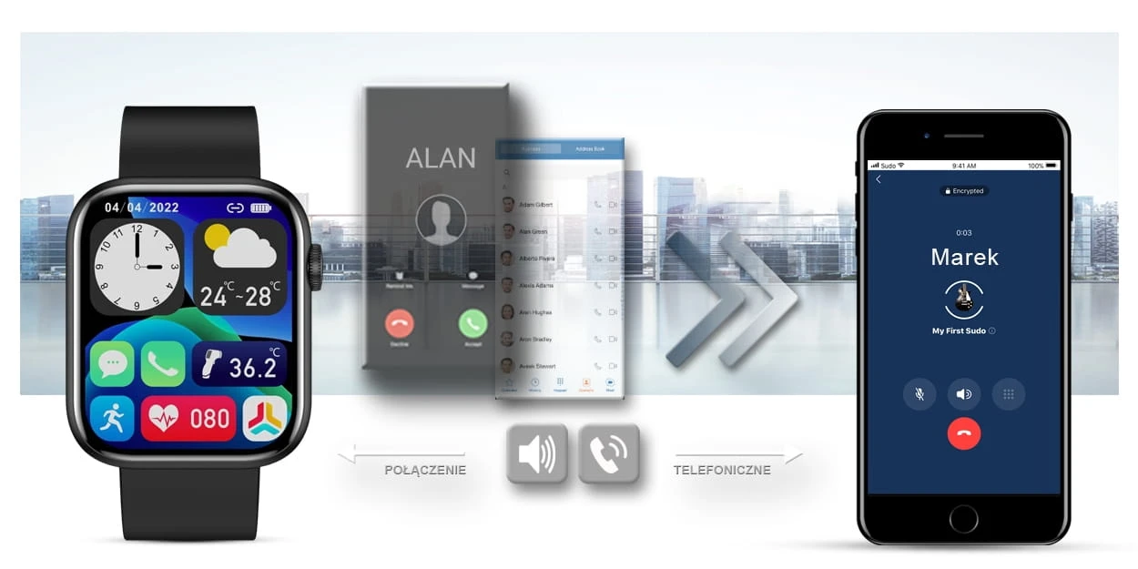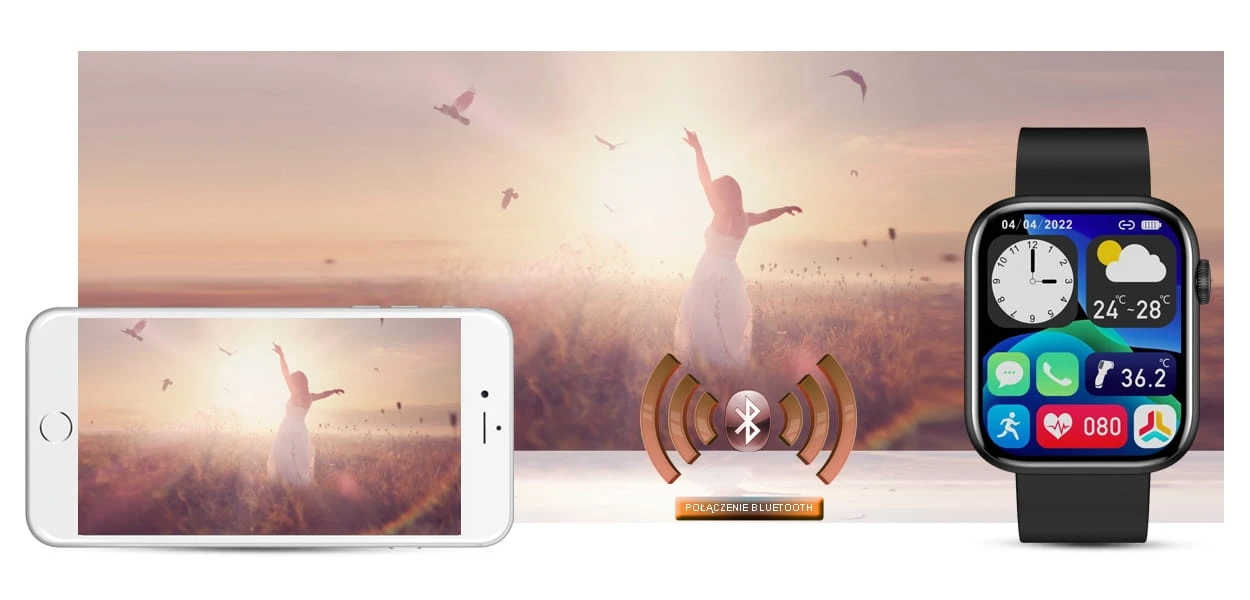 Ten smartwatch możesz połączyć ze swoim Smartfonem. Kompatybilność z systemem Android 4.4 i nowszy oraz iOS 9.0 i nowszy. Oznacza to, że smartwatch połączy się ze wszystkimi telefonami na systemie ANDROID i iOS.