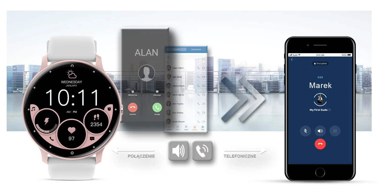 Po sparowaniu smartwatcha z twoim smartfonem, możesz bezproblemowo odbierać i wykonywać połączenia telefoniczne. Wbudowany głośnik oraz mikrofon pozwala rozmawiać bez konieczności wyciągania telefonu komórkowego.
