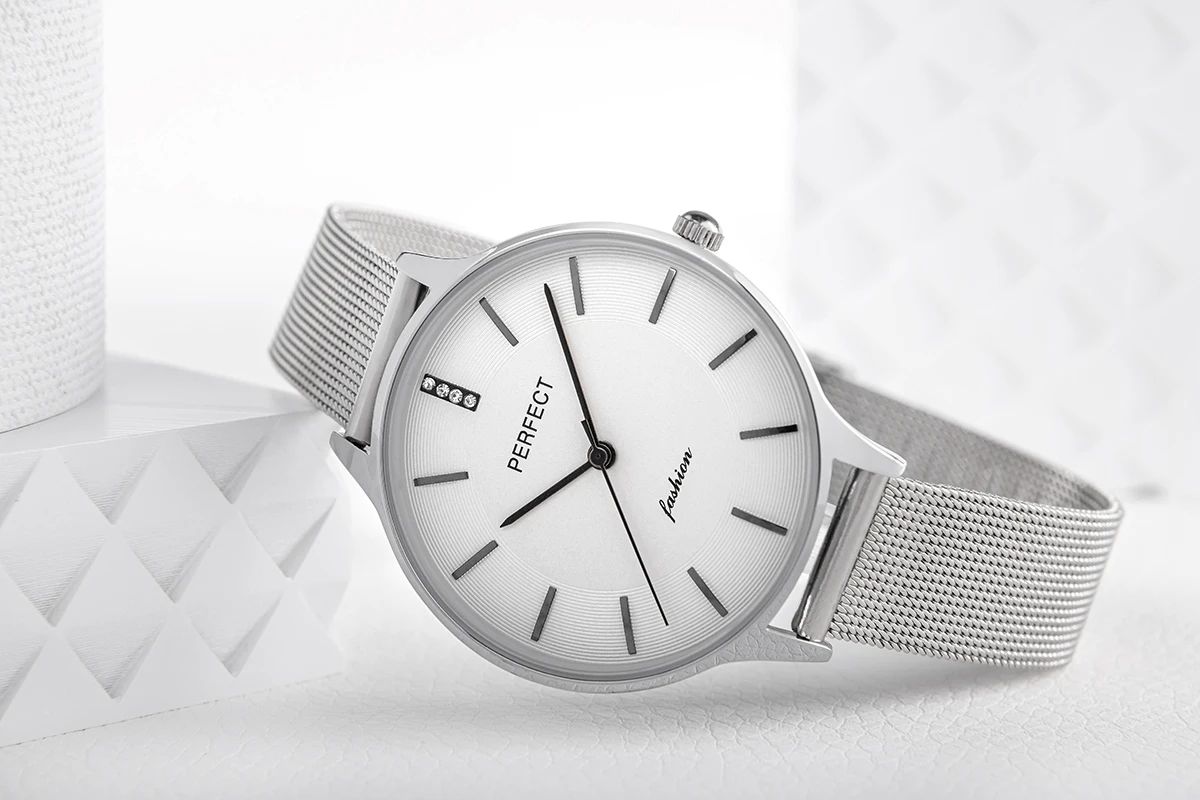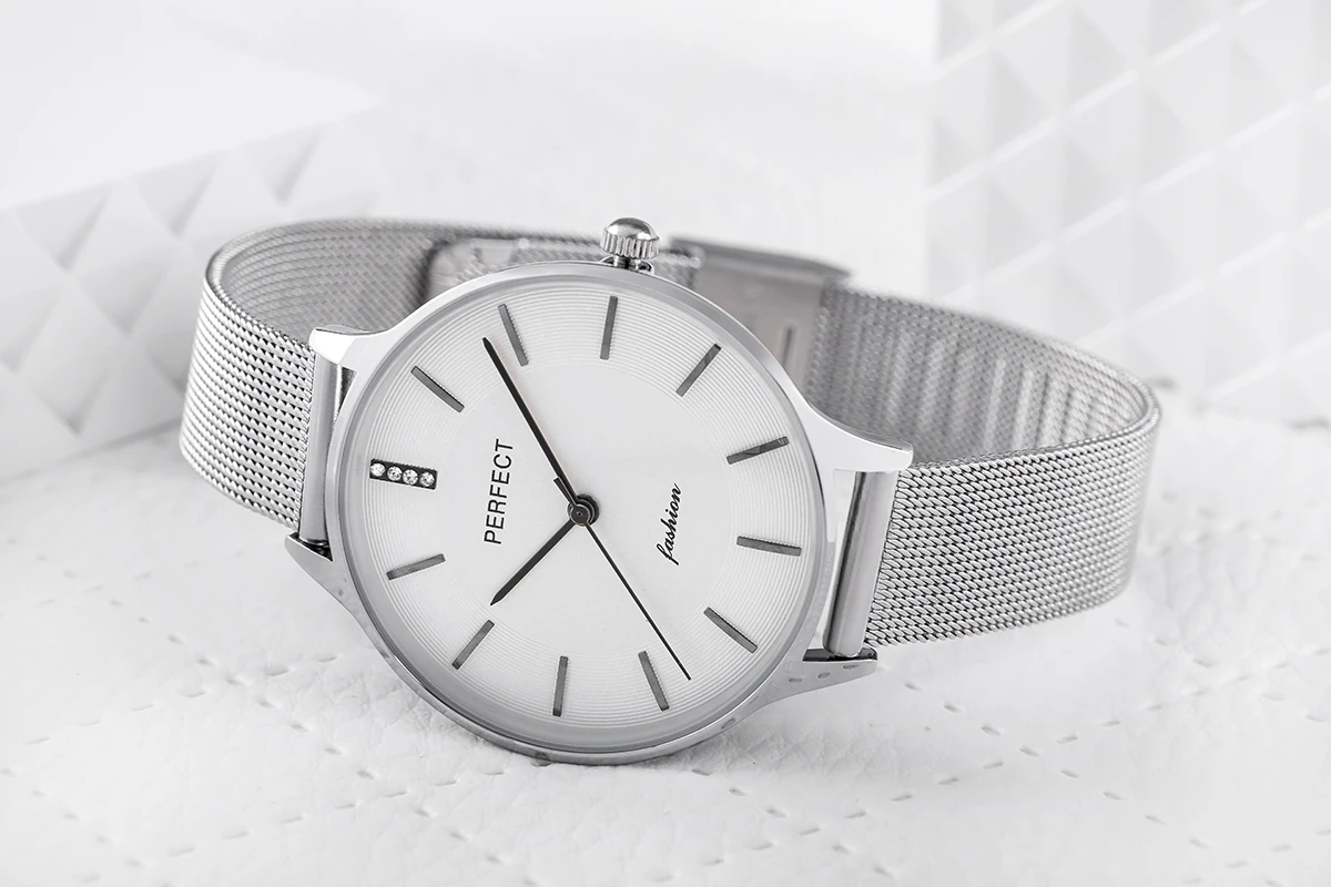 Wykonana z wysokiej jakości stali, idealnie dopasowuje się do damskiego nadgarstka, zapewniając wygodę noszenia przez cały dzień. Jej elegancka struktura i zapięcie ozdobione logiem marki Perfect dodają zegarkowi wyjątkowego stylu i wyróżniają go na tle innych.