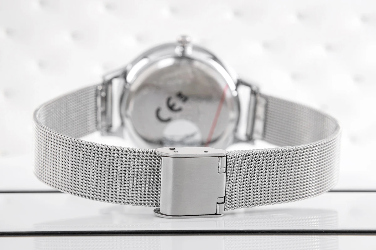 Ten zegarek to harmonijne połączenie klasyki i nowoczesności, które przyciąga wzrok swoją wyrazistością. Srebrna koperta otula białą tarczę, tworząc elegancką ramę dla czarnych indeksów, które, ozdobione cyrkoniami, delikatnie połyskują, dodając odrobiny luksusu. Czarne wskazówki i sekundnik, precyzyjnie przesuwające się po tarczy, tworzą mocny kontrast z jej jasnym tłem, zapewniając czytelność i stylowy wygląd.
