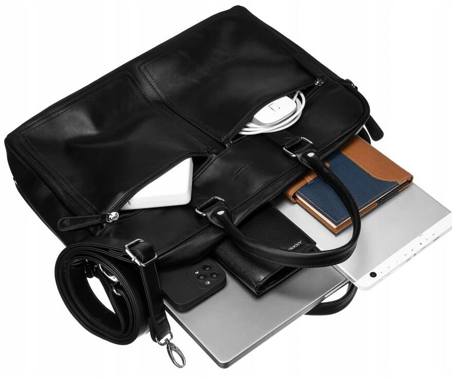 - Dzięki dużej pojemności torba pomieści dokumenty, raporty, laptop oraz drobiazgi, zapewniając pełną organizację i porządek.