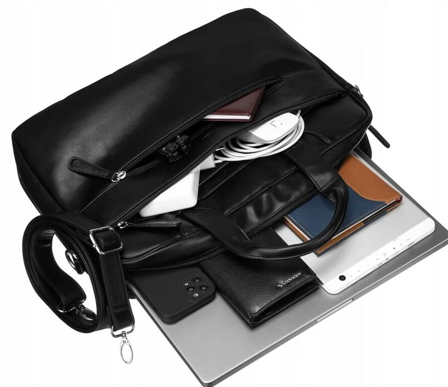 Elegancka i praktyczna: Torba z trwałej skóry ekologicznej, z kieszenią na laptopa 14", licznymi przegródkami i regulowanym paskiem. Idealna do pracy, szkoły i codziennego użytku.