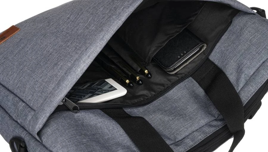 Torba jednokomorowa zamykana solidnym zamkiem błyskawicznym. Środek w całości na podszewce w czarnym, niebrudzącym kolorze. Wewnątrz torby znajduje się duża przegroda na urządzenie przenośne z matrycą do 15 cali. Urządzenie zabezpieczysz przed wysunięciem paskiem na rzep. Oprócz tego, w komorze wyszyto dwie otwarte kieszonki.