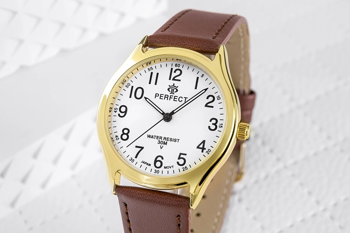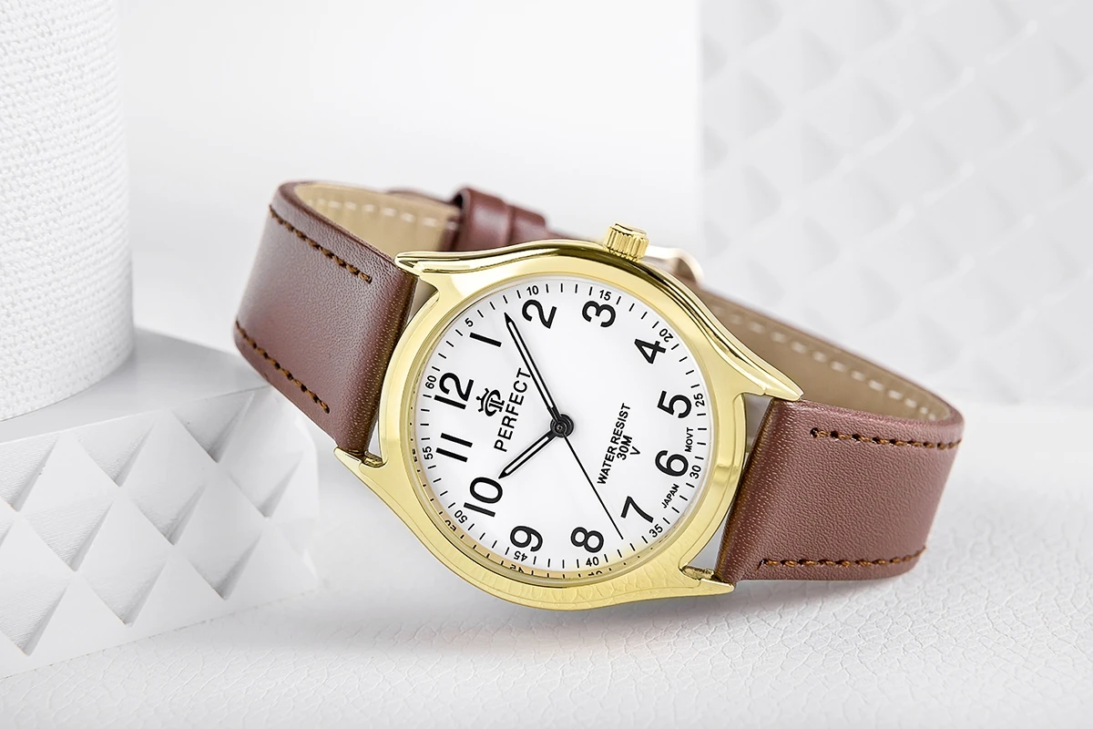 Skórzany pasek tego zegarka to kwintesencja klasy i wygody. Wykonany z najwyższej jakości materiału, komfortowo dopasowuje się do nadgarstka, oferując nie tylko trwałość, ale też elegancki wygląd. Jego miękkość zapewnia komfort noszenia na co dzień, a perfekcyjne wykończenie podkreśla charakterystyczny styl marki Perfect.