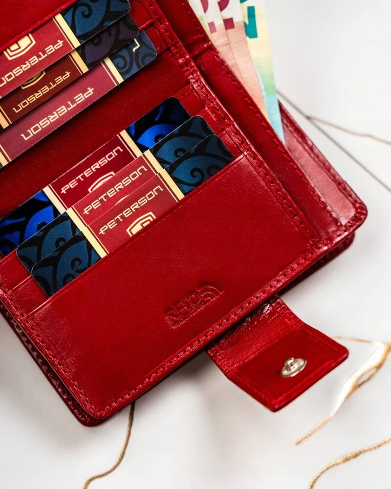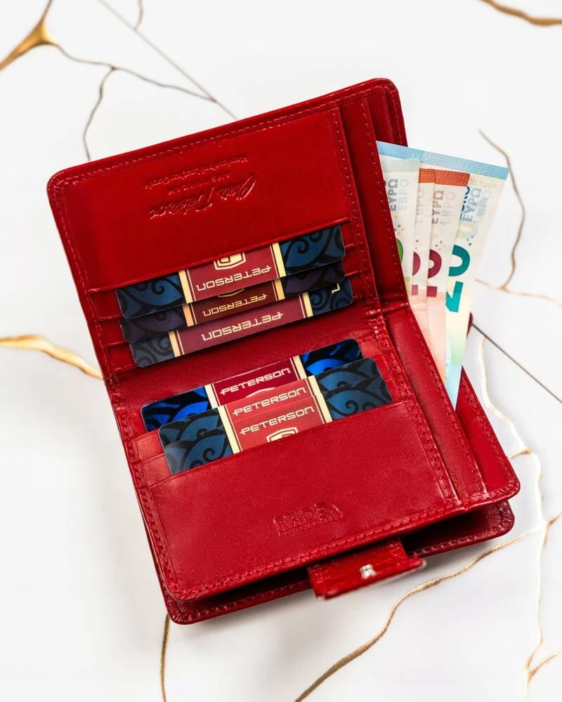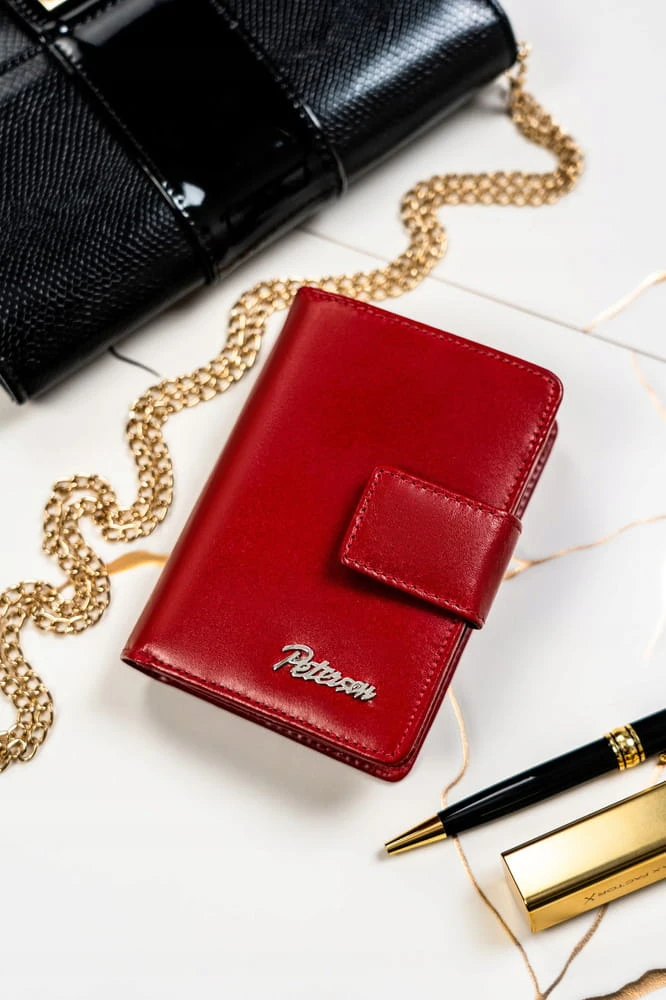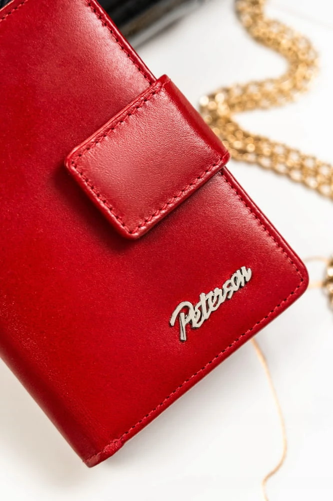 Zestaw prezentowy Peterson – skórzany portfel damski i brelok do kluczy. Portfel pionowy, pojemny, z 6 przegródkami na karty, 2 kieszonkami na dokumenty i podwójną kieszenią na bilon. Wyposażony w technologię RFID chroniącą karty zbliżeniowe. Brelok trwały, skórzany, długość 9 cm. Idealny prezent dla kobiety, elegancki i funkcjonalny, gotowy do wręczenia w pudełku.