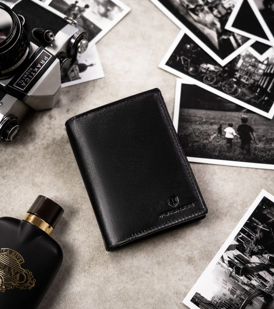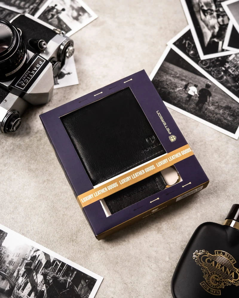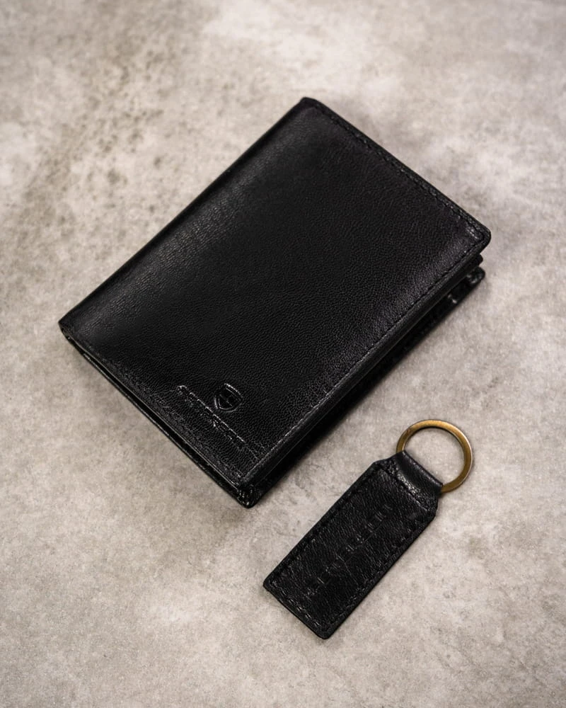 Stylowy zestaw upominkowy składający się z portfela oraz breloczka do kluczy wykonanych ze skóry naturalnej i zapakowanych w firmowe pudełko. Idealny pomysł na praktyczny i elegancki podarunek: