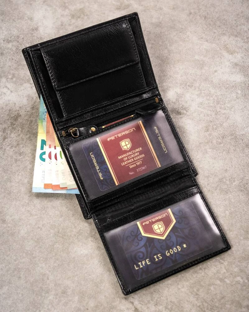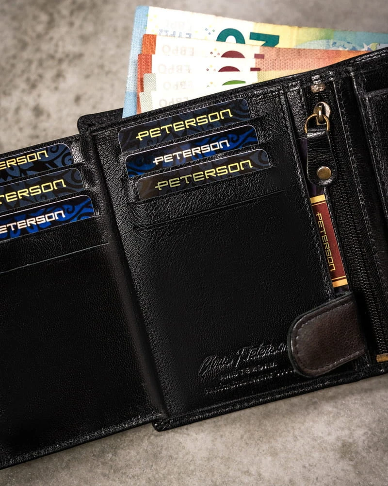 Portfel jest bardzo pojemny również w kwestii gotówki. Kieszenie na pieniądze, podobnie jak przegródki na karty także wyściełane są odporną na otarcia podszewką.