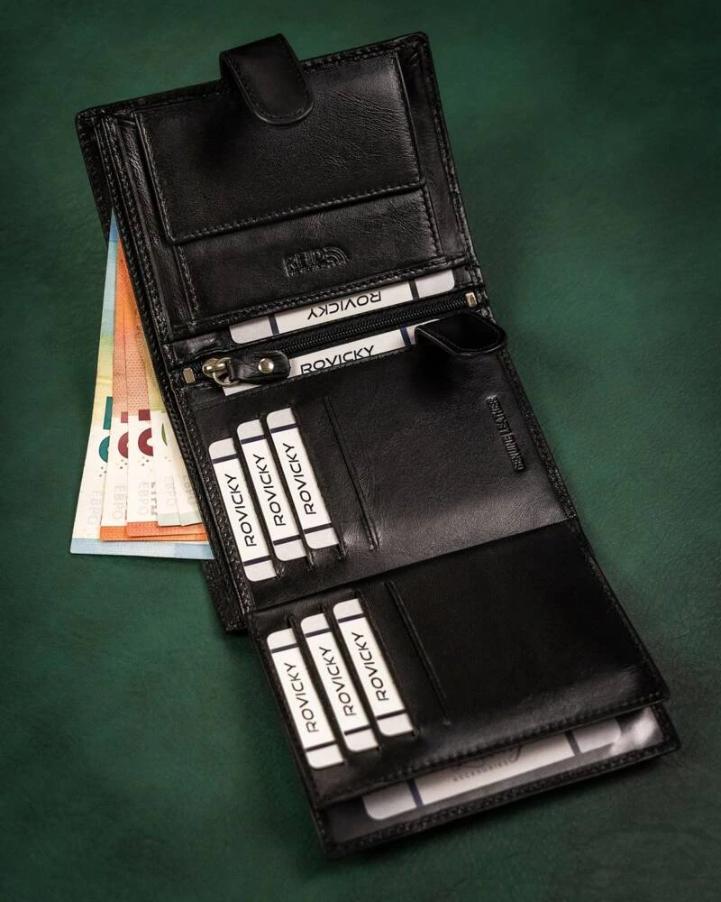 - 11 przegródek na karty, wizytówki czy dokumenty o standardowym formacie jak karta debetowa czy prawo jazdy, jedną z przegródek umieszczono z tyłu portfela. To idealne miejsca na kartę, której używasz najczęściej;