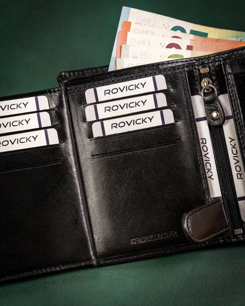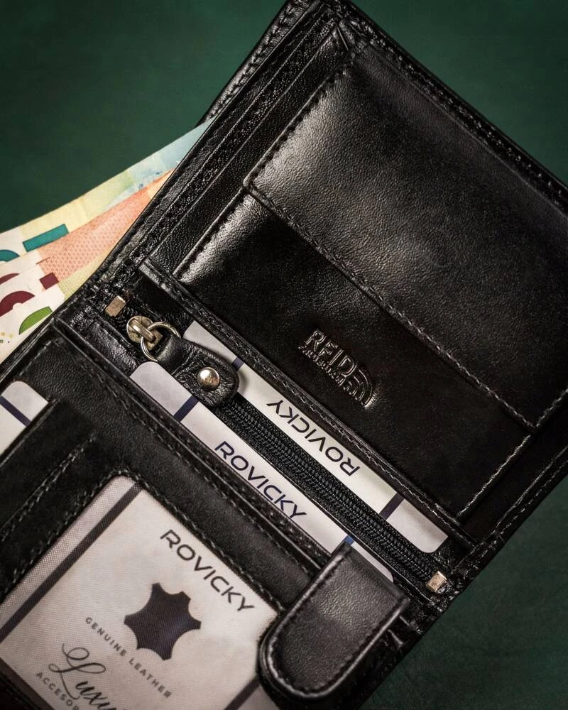 - 11 przegródek na karty, wizytówki czy dokumenty o standardowym formacie jak karta debetowa czy prawo jazdy, jedną z przegródek umieszczono z tyłu portfela. To idealne miejsca na kartę, której używasz najczęściej;