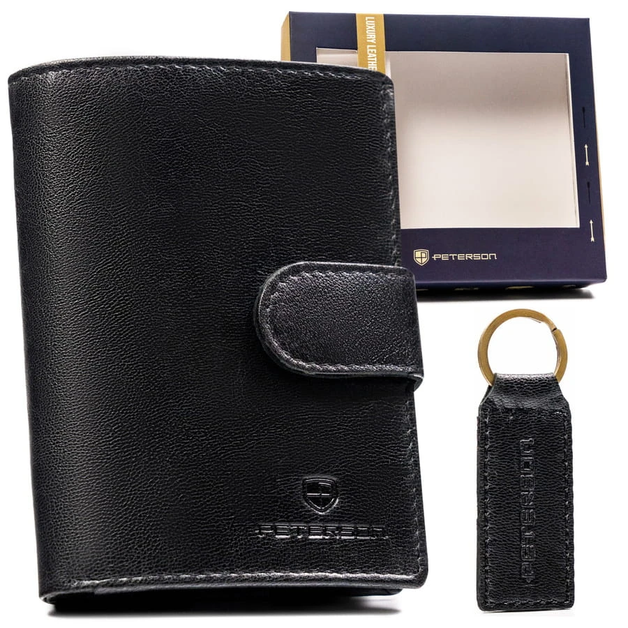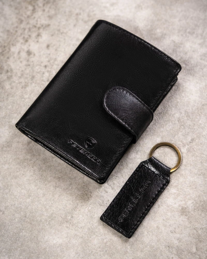 Zestaw prezentowy: pionowy, skórzany portfel męski i brelok — Peterson