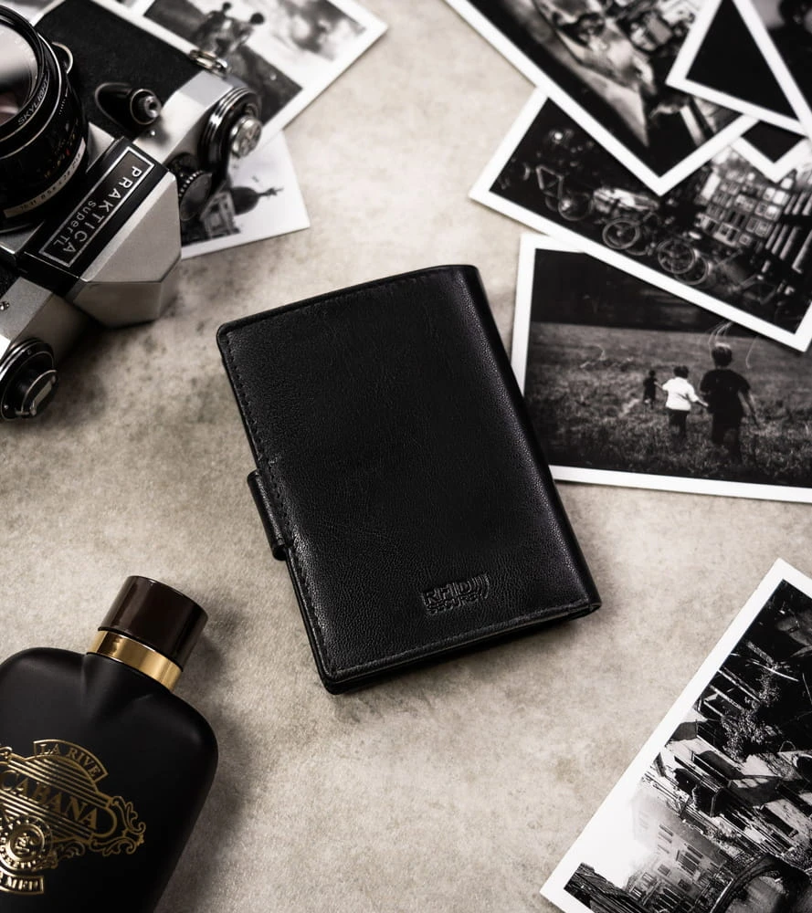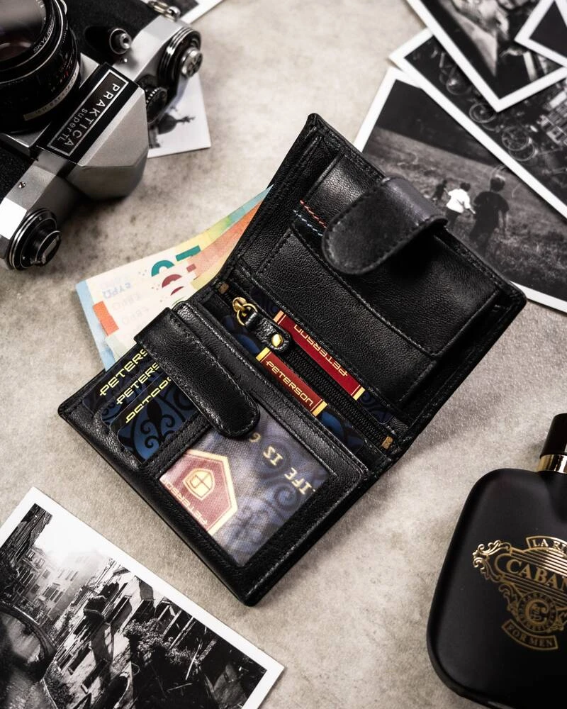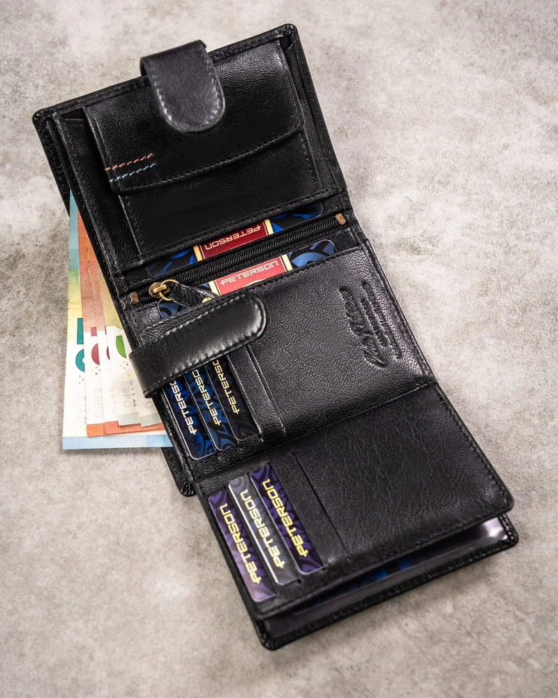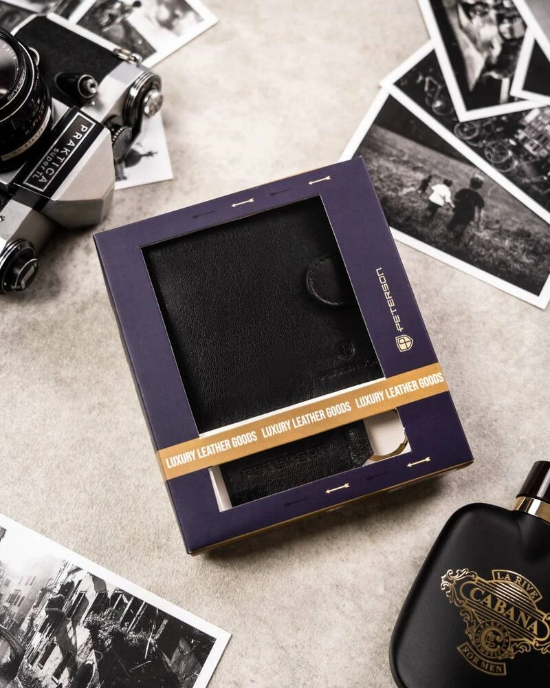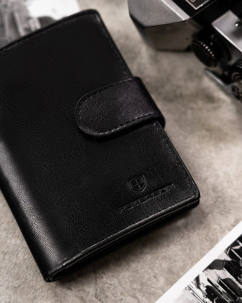 - Klasyczny portfel dla Panów w każdym wieku | Portfel w czarnym kolorze. Front zdobi tłoczone logo marki. Model w orientacji pionowej z zapięciem zewnętrznym;