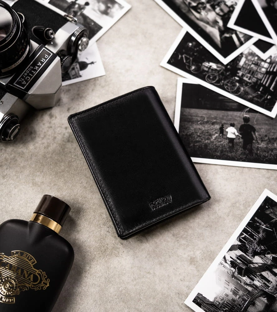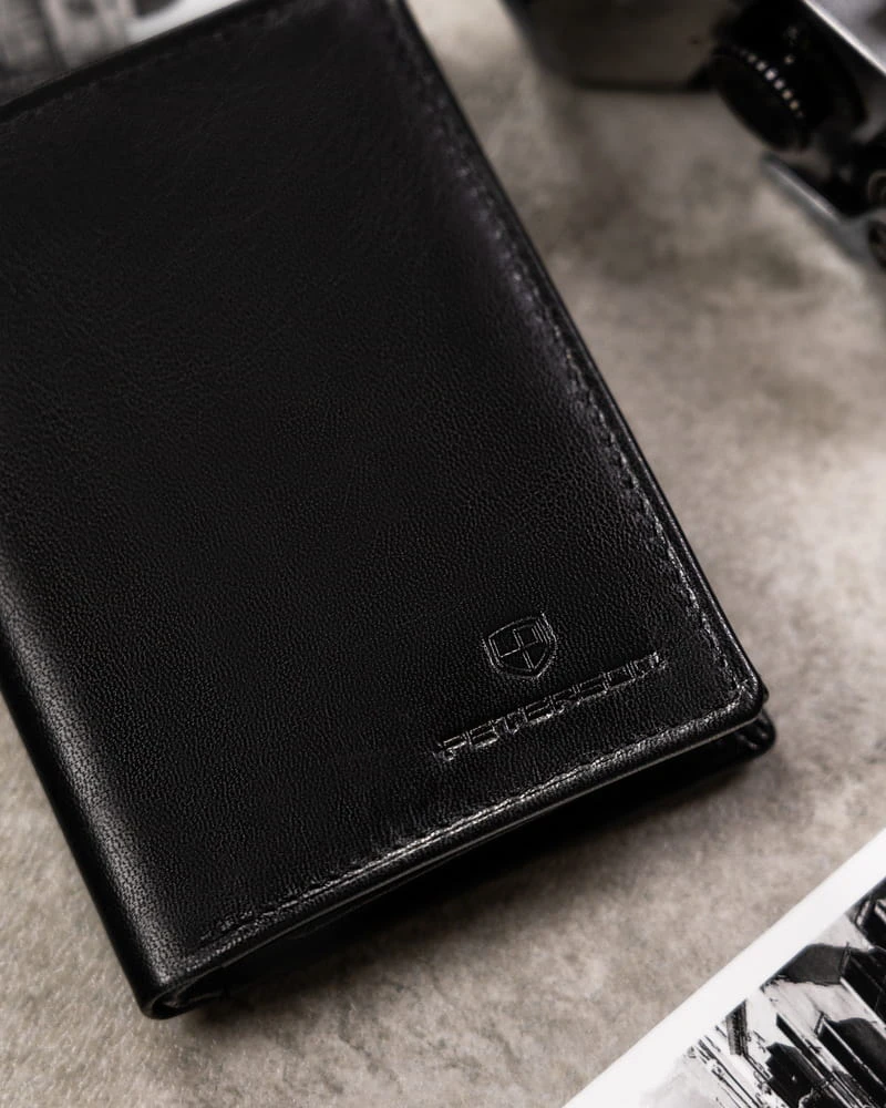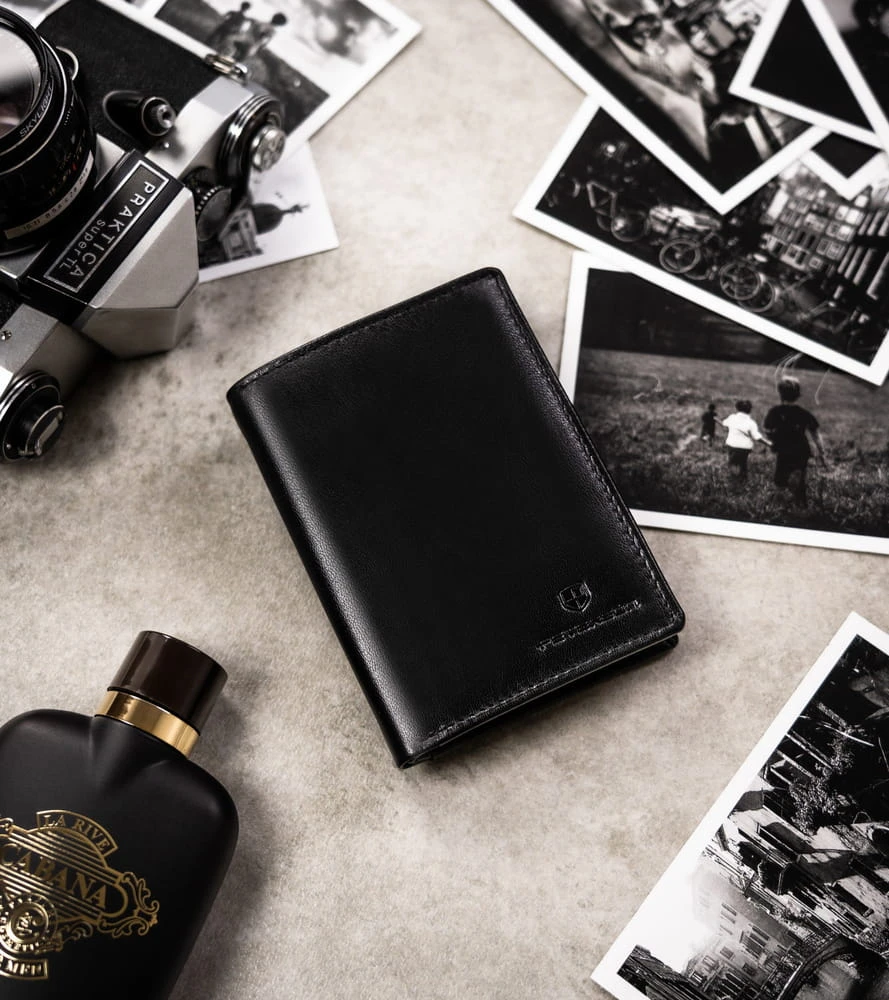- Klasyczny portfel dla Panów w każdym wieku | Portfel w czarnym kolorze. Front zdobi tłoczone logo marki. Model w orientacji pionowej bez zapięcia;