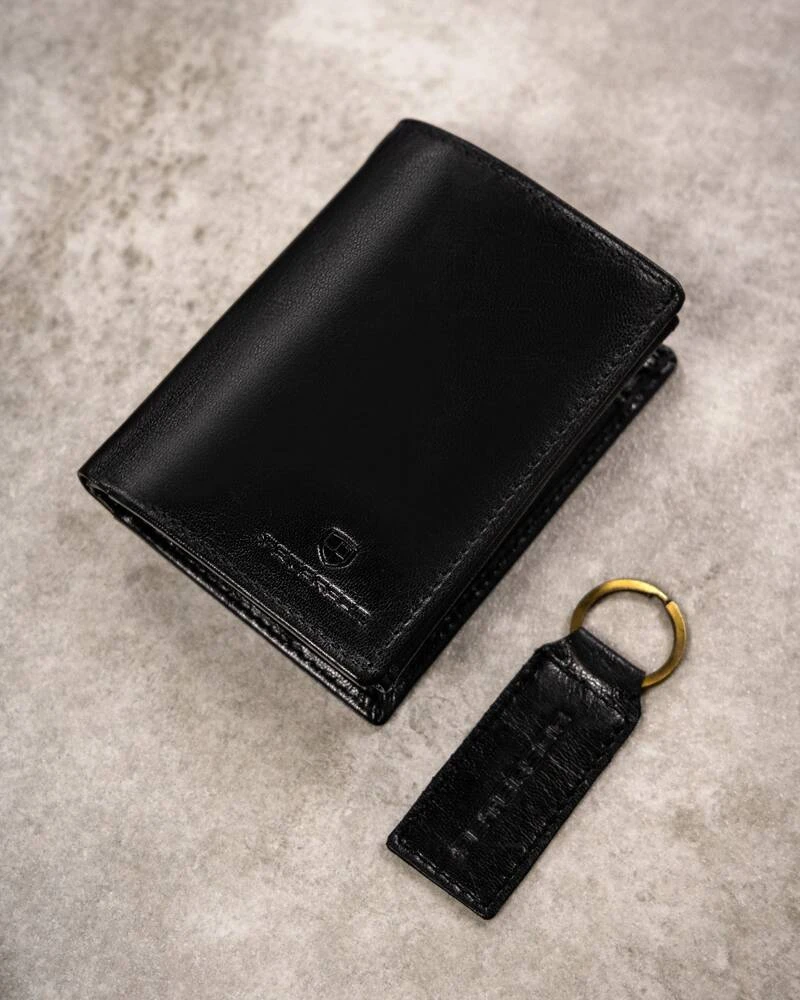 Zestaw prezentowy: pionowy, skórzany portfel męski i brelok — Peterson