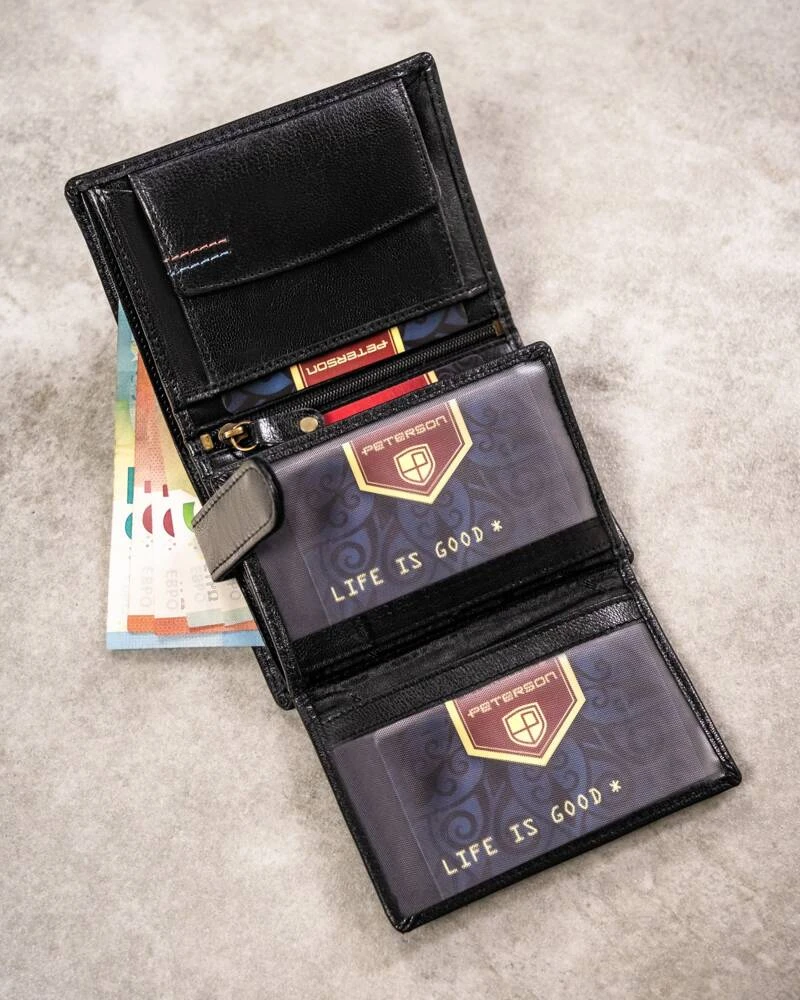 - Pojemny portfel ze świetną organizacją wnętrza| Bez problemu mieści karty i dokumenty, które wszyscy posiadamy, jak dowód osobisty czy prawo jazdy, ale też dokumenty o większym formacie, nie mówiąc już o gotówce - z łatwością zmieścisz tu wiele monet i banknotów;