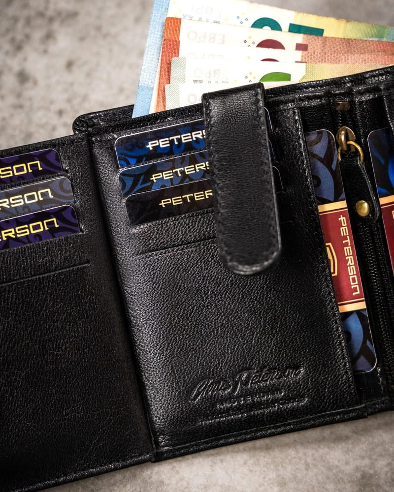 Środek portfela został zaprojektowany tak, abyś mógł zmieścić wszystkie karty, dokumenty i pieniądze, które na co dzień potrzebujesz. Przegródki na karty i dokumenty są zabezpieczone odporną na otarcia logowaną podszewką. Pozwala to uniknąć uszkodzeń na skórze, podczas wkładania i wyjmowania kart.