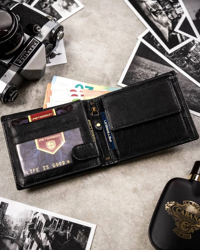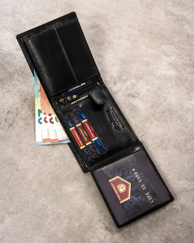 - banknoty schowasz do 2 otwartych kieszonek umiejscowionych po całej długości portfela.