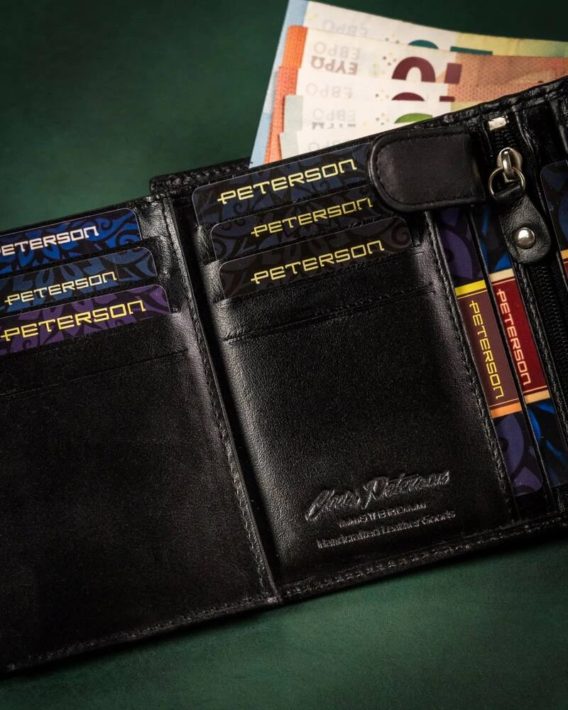 - 1 schowek na suwak wyszyty w centralnej części portfela.